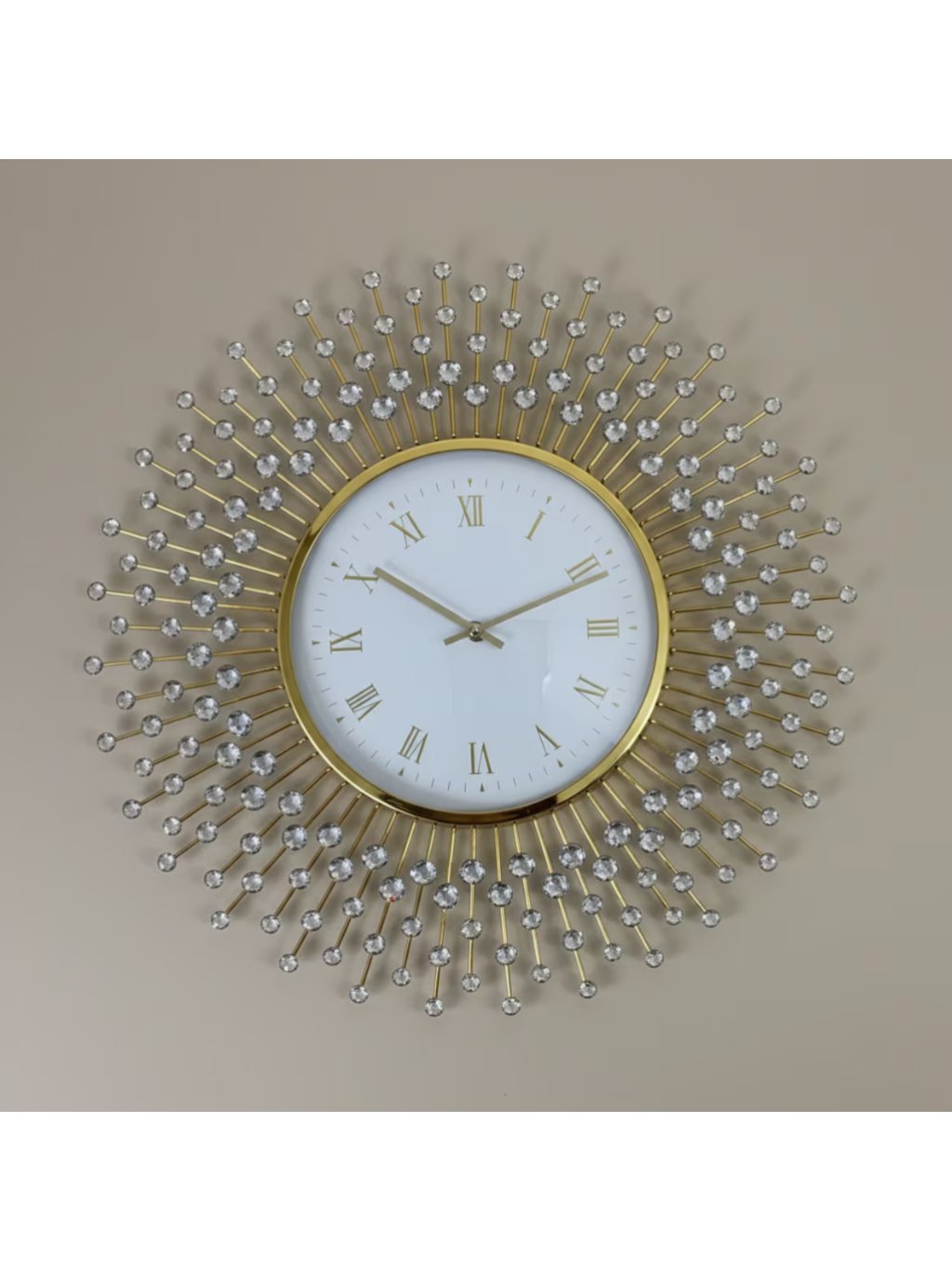 Oživte svoj interiér luxusným doplnkom. Tieto kovové hodiny s priemerom 61 cm spájajú zlatý lesk s modernými prvkami z akrylu a skla, čím vytvárajú dokonalú dominantu každej obývacej izby či spálne.