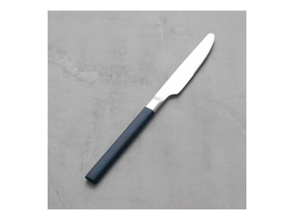 Strieborno modrý nôž z nehrdzavejúcej ocele. Má klasický design. Vhodná do domácností, aj pre profesionálnu gastronómiu