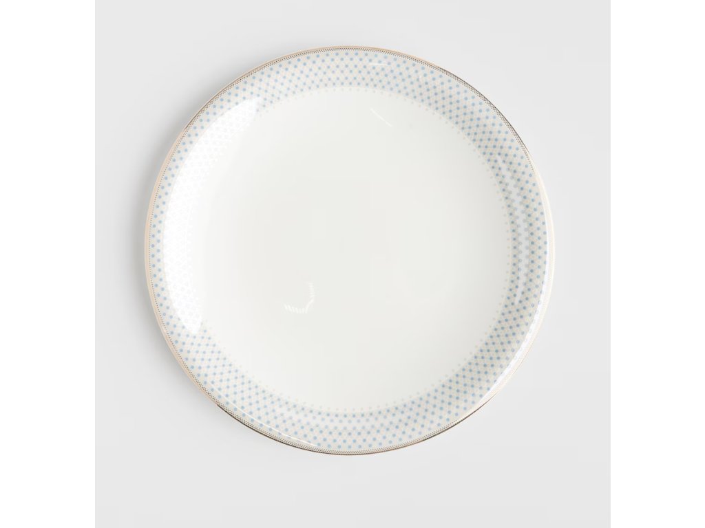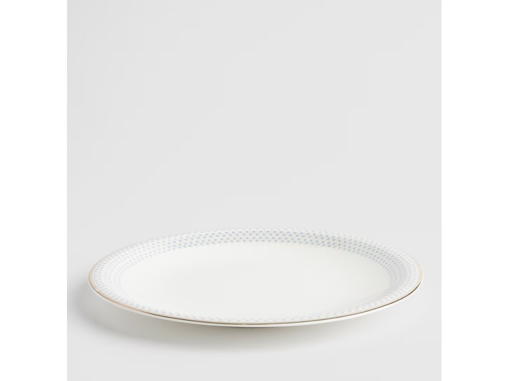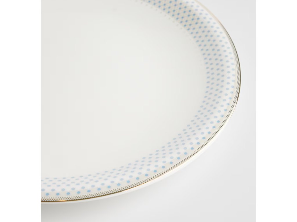 Pôvabný obedový tanier, vyrobený z porcelánu a zdobený decentným vzorom modrých bodiek na bielom pozadí. Je ideálny na servírovanie rôznych obedových jedál. Kombinácia klasického tvaru s decentným, farebným zdobením znamená, že tanier sa dokonale hodí na každodenné aj slávnostné prestieranie stola. Je odolný a ľahko sa čistí, čím spája funkčnosť s estetikou.