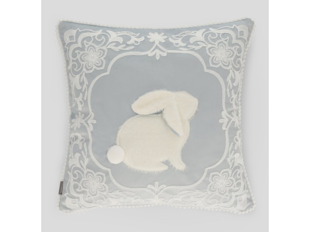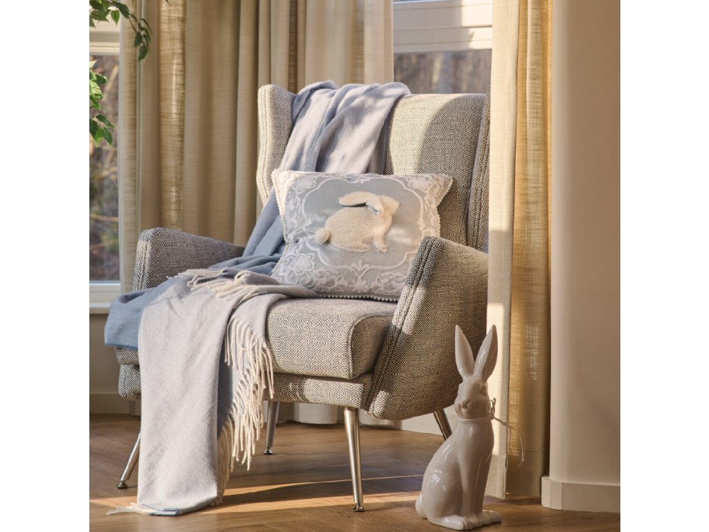 Modrá obliečka na vankúš z polyesteru s očarujúcim veľkonočným motívom v rozmere 45 cm x 45 cm. Je to ideálne riešenie pre sviatočné interiérové aranžmány.