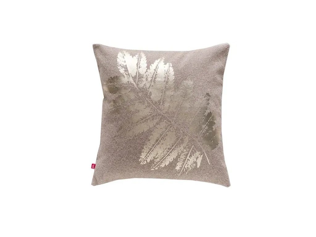Dekoratívna obliečka na vankúš vyrobená z hnedého polyesteru s originálnou zlatou potlačou v podobe konára papradia je úžasným riešením, ako dodať vášmu čalúnenému nábytku a vášmu domovu osobité čaro a sofistikovanosť.