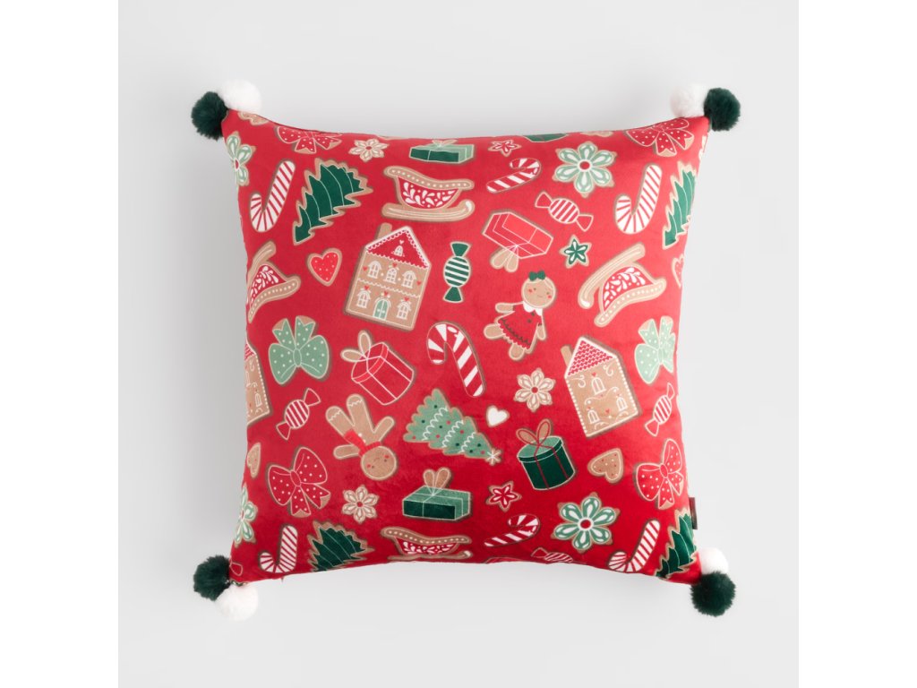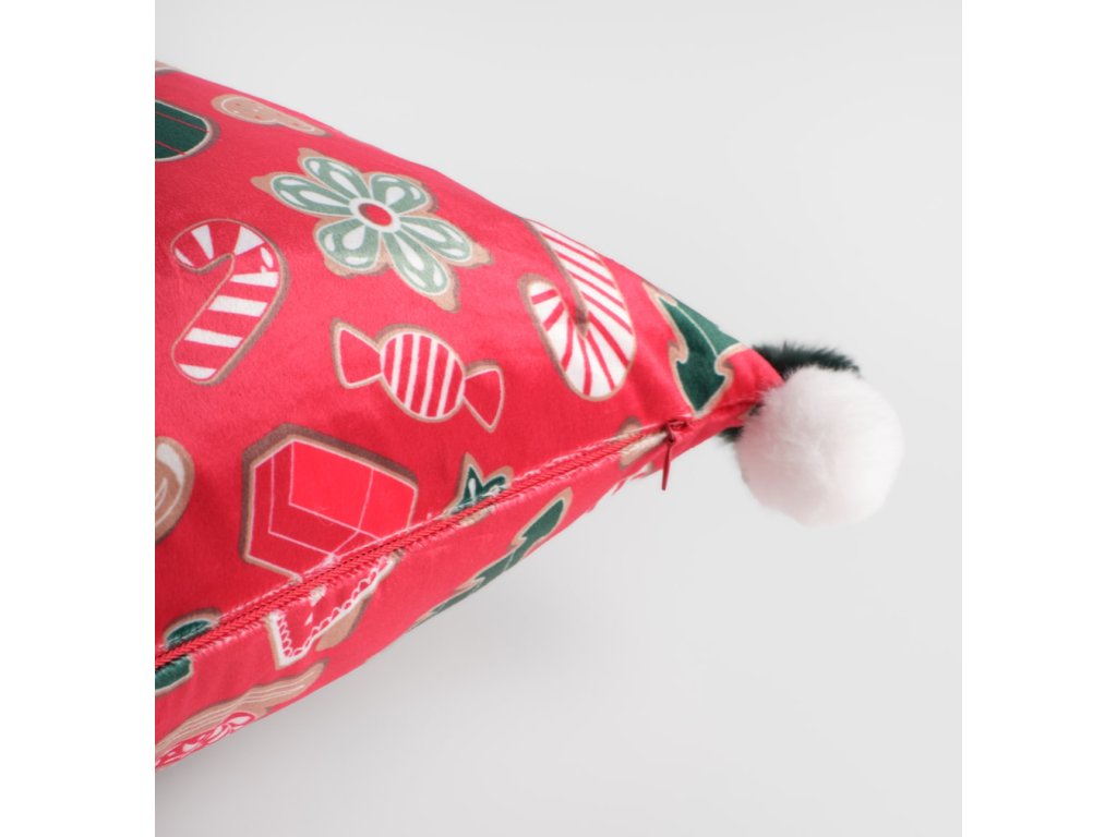 Výrazná červená farba tvorí perfektné pozadie pre tlačené sviatočné motívy – medovníčky, cukrovinky, vianočné stromčeky a listy cezmíny v zelenej, bielej a béžovej farbe. Drobné detaily, ako sú ozdobné strapce (pompony) v rohoch alebo diskrétny zips, dotvárajú celok so zmyslom pre estetiku. Obliečka Ginno sa fantasticky hodí do interiérov zariadených tak v klasickom, ako aj v modernom štýle. Je to vynikajúca voľba do obývačky, spálne či detskej izby a skvelý tip na vianočný darček.