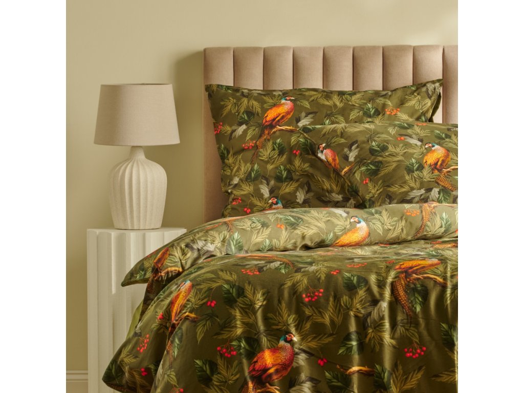 Intenzívny tmavozelený odtieň spojený s motívom exotických vtákov a listov vytvára neopakovateľnú, tropickú atmosféru. Zadná strana obliečok zostáva jednofarebná, čo podčiarkuje starostlivé vyhotovenie. Kolekcia Bazanti harmonicky doplní moderné, jungle či boho aranžmány, a osvedčí sa aj ako nápaditý darček do nového bytu.