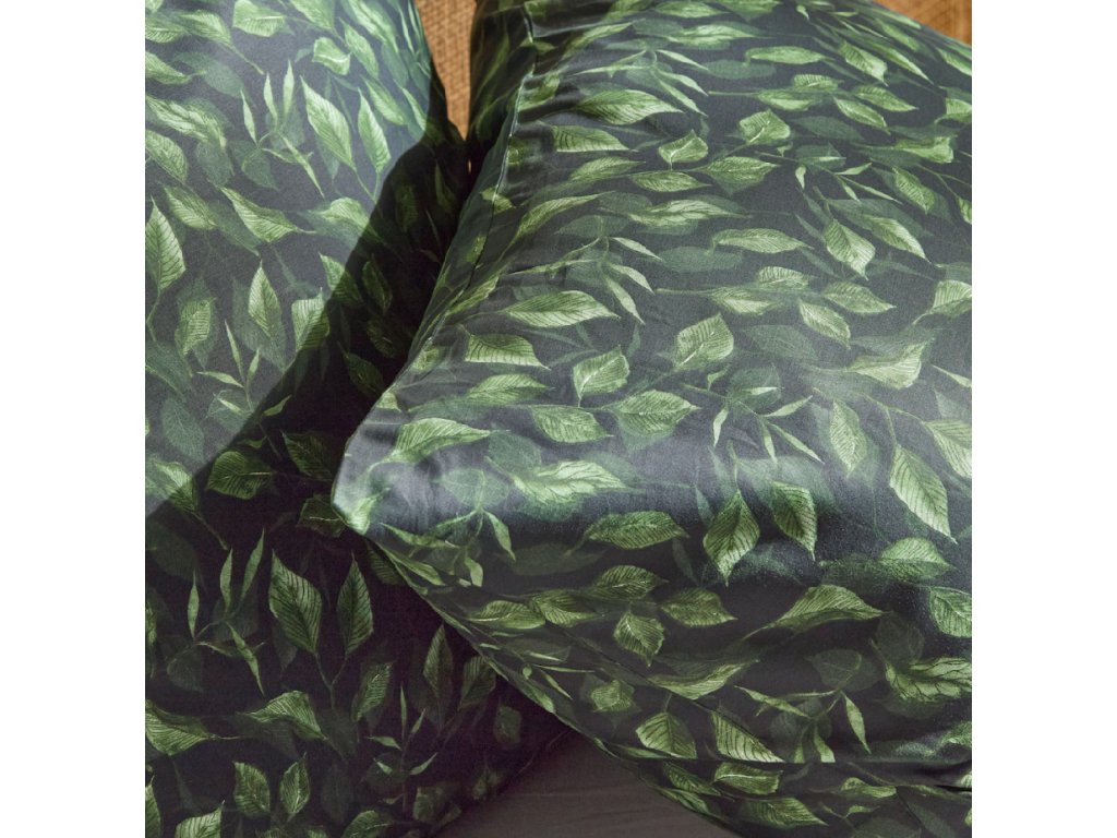 Elegantné obliečky z vysokokvalitného bavlneného saténu s gramážou 115 g/m². Hlboká čierna farba podkladu v kombinácii so zeleným, rastlinným vzorom vytvára modernú a štýlovú kompozíciu, ideálnu do spálne v duchu urban jungle alebo glamour. Jemne lesklý bavlnený satén je mäkký, hladký a príjemný pre pokožku, a zároveň zaisťuje komfortný spánok po celý rok.