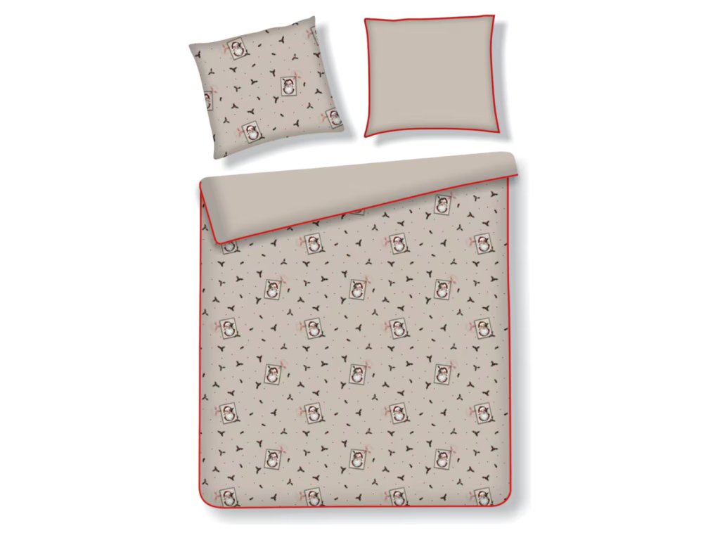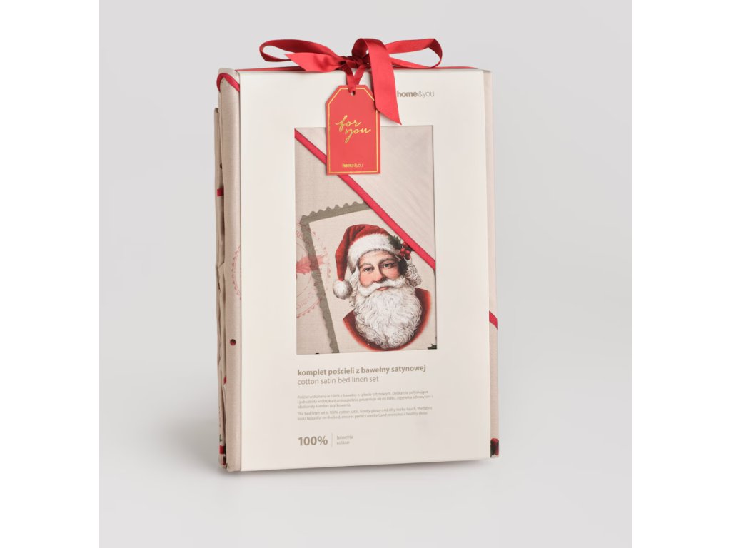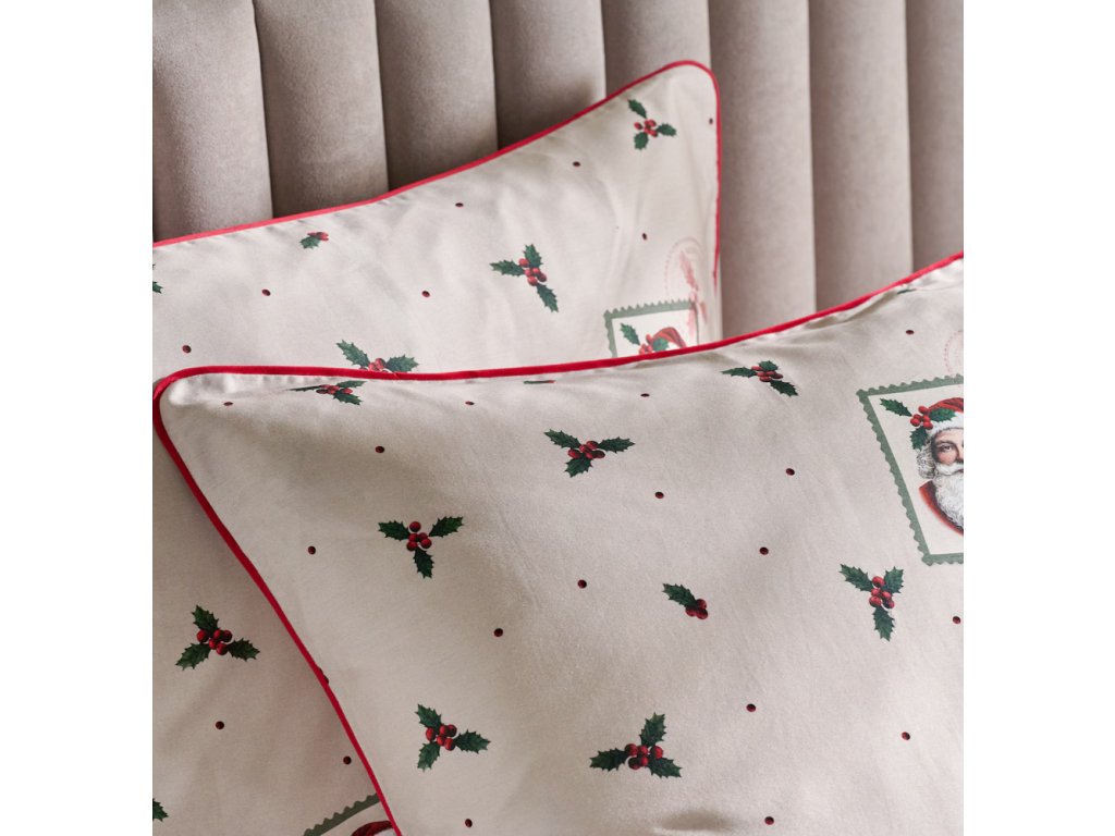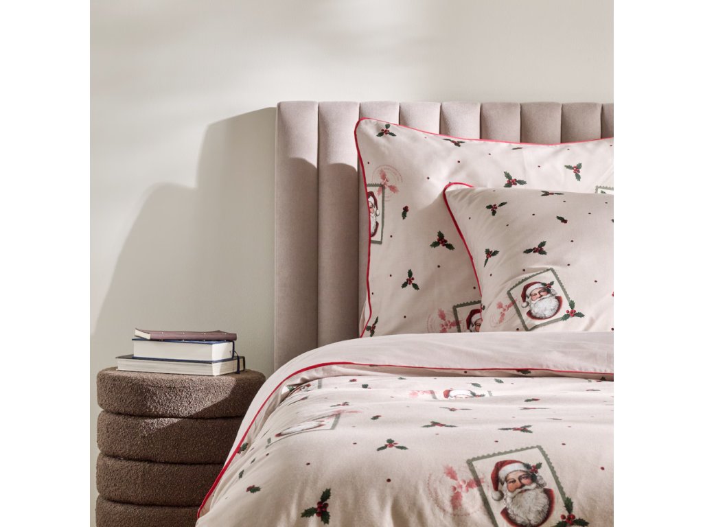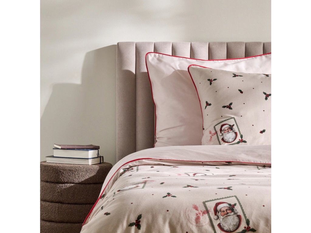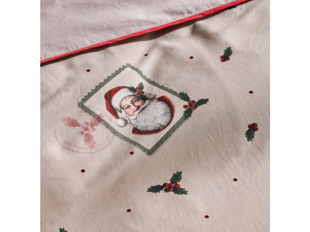 Béžová farba v kombinácii s akcentmi červenej a zelenej a sviatočnými motívmi – Mikulášom, cezmínou a decentnými bodkami – spôsobuje, že obliečky Winterpost sa výborne hodia do zimných, sviatočných aranžmánov interiéru. Precízne, výrazné potlače a ozdobné červené lemovanie dodávajú celku ušľachtilosť a eleganciu. Súprava dokonale podčiarkne štýl klasickej, útulnej alebo škandinávskej spálne a skvele poslúži ako darček na Vianoce pre blízku osobu.