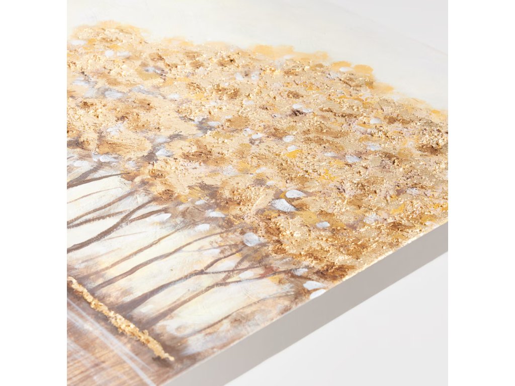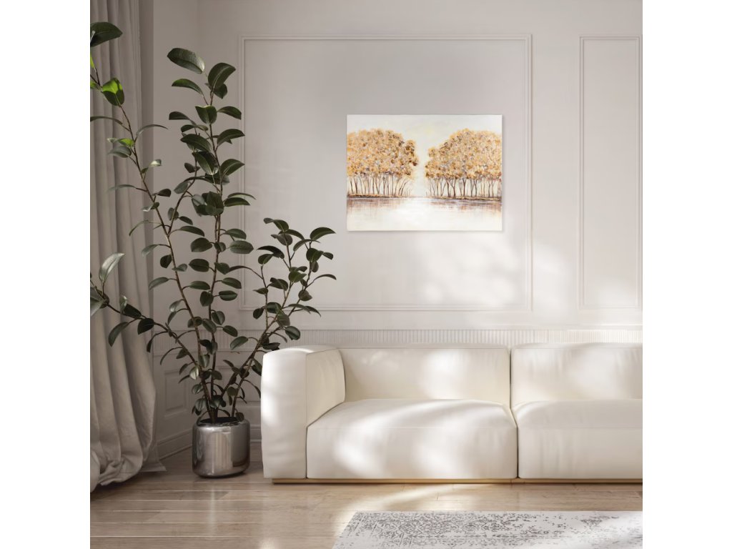 Ponorte sa do pokojnej atmosféry tohto ručne dekorovaného obrazu. Zlatistý odlesk jesenného lesa sa vyníma na svetlom béžovom pozadí, vytvárajúc dojem lúča svetla prenikajúceho cez koruny stromov. Scéna pripomína snovú krajinu pri vode, kde odrazy dodávajú hĺbku a eleganciu. Ideálny doplnok pre tých, ktorí hľadajú v interiéri harmóniu, teplo a nádych luxusu. Plátno s motívom krajiny v zlatom a béžovom tóne s rozmermi 100x75 cm.