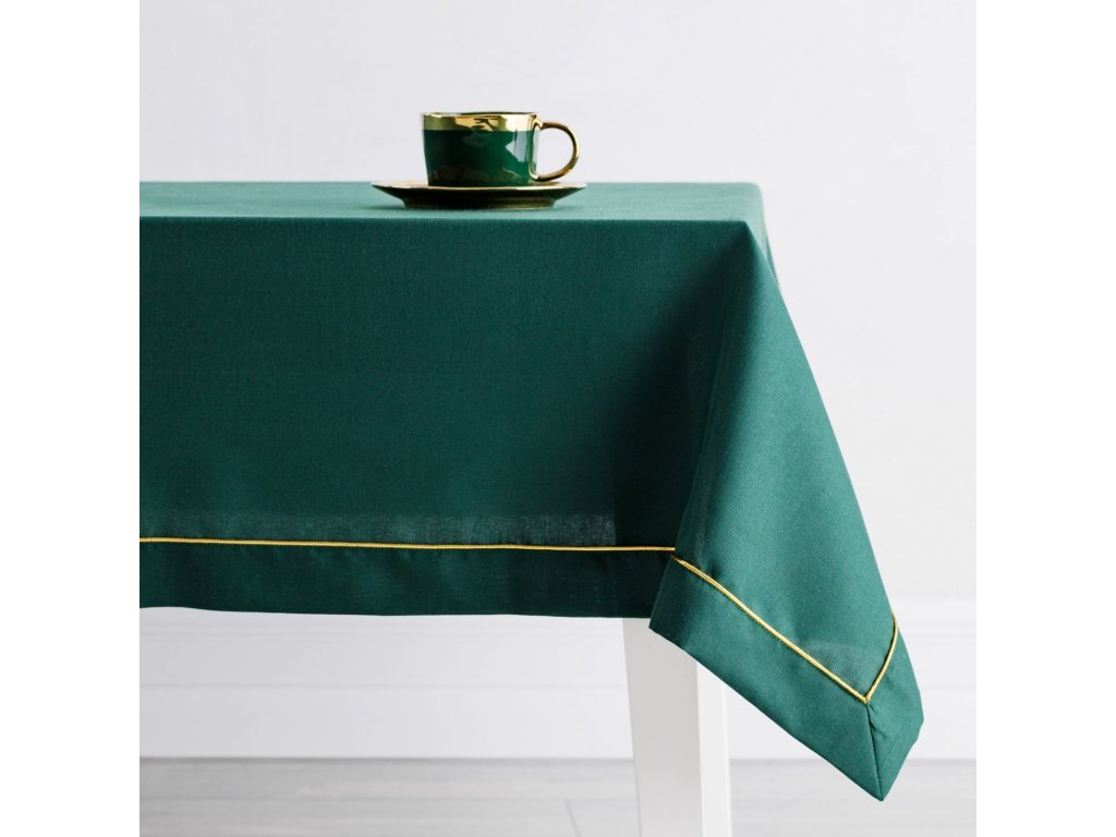 Obrus od poľského výrobcu Home&You „Tidem“ je dokonalou kombináciou elegancie a praktickosti. Vyrobený v sýtozelenej farbe, dodáva každému stolu sofistikovaný a luxusný vzhľad. Zlatý pruh pozdĺž okrajov obrusu dodáva nádych elegancie, vďaka čomu je ideálnou voľbou pre slávnostné aj každodenné večere.