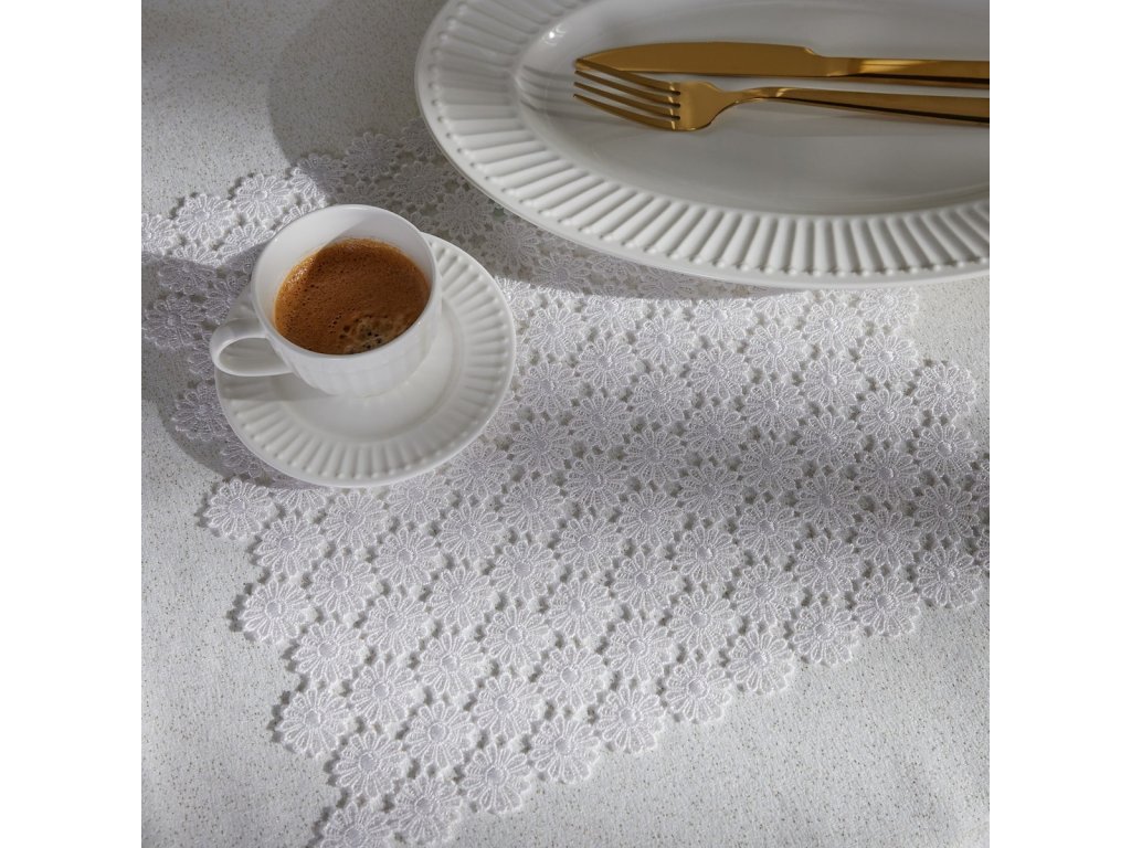 áto biela polyesterová obrúska s metalickými vláknami je decentnou a elegantnou dekoráciou stola. Je ideálna na špeciálne príležitosti aj do každodenného interiéru. Jej jemný lesk a klasický dizajn dodávajú každej miestnosti nádych ľahkosti a elegancie, zatiaľ čo odolný materiál zaisťuje jednoduchú údržbu.