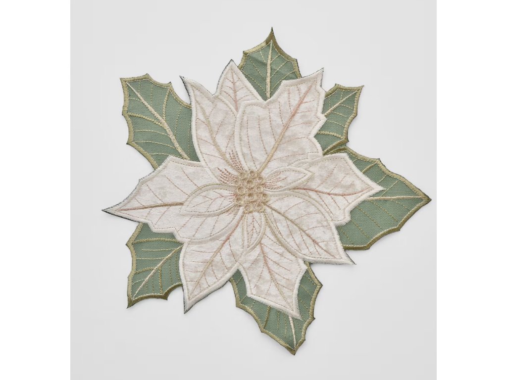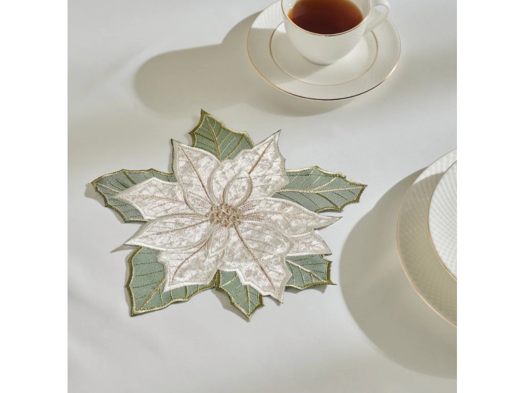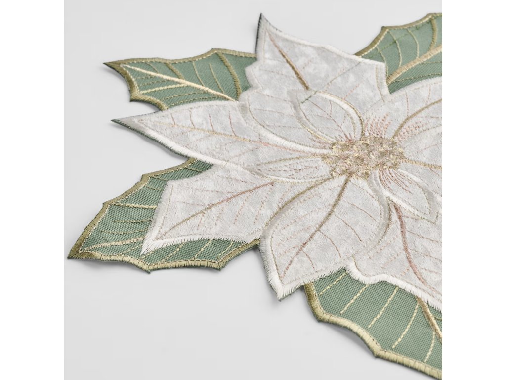 Biela farba obrúska, spojená s vyšívaným vzorom vianočnej hviezdy a zlatými a zelenými akcentmi, vytvára nadčasovú dekoráciu stola.