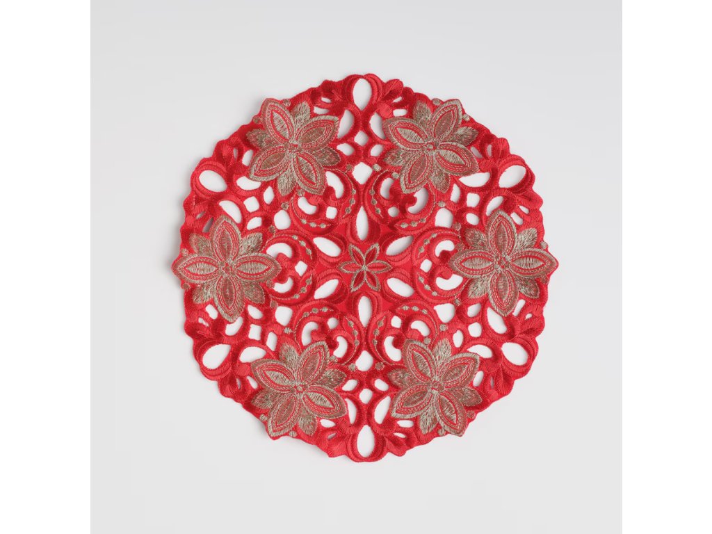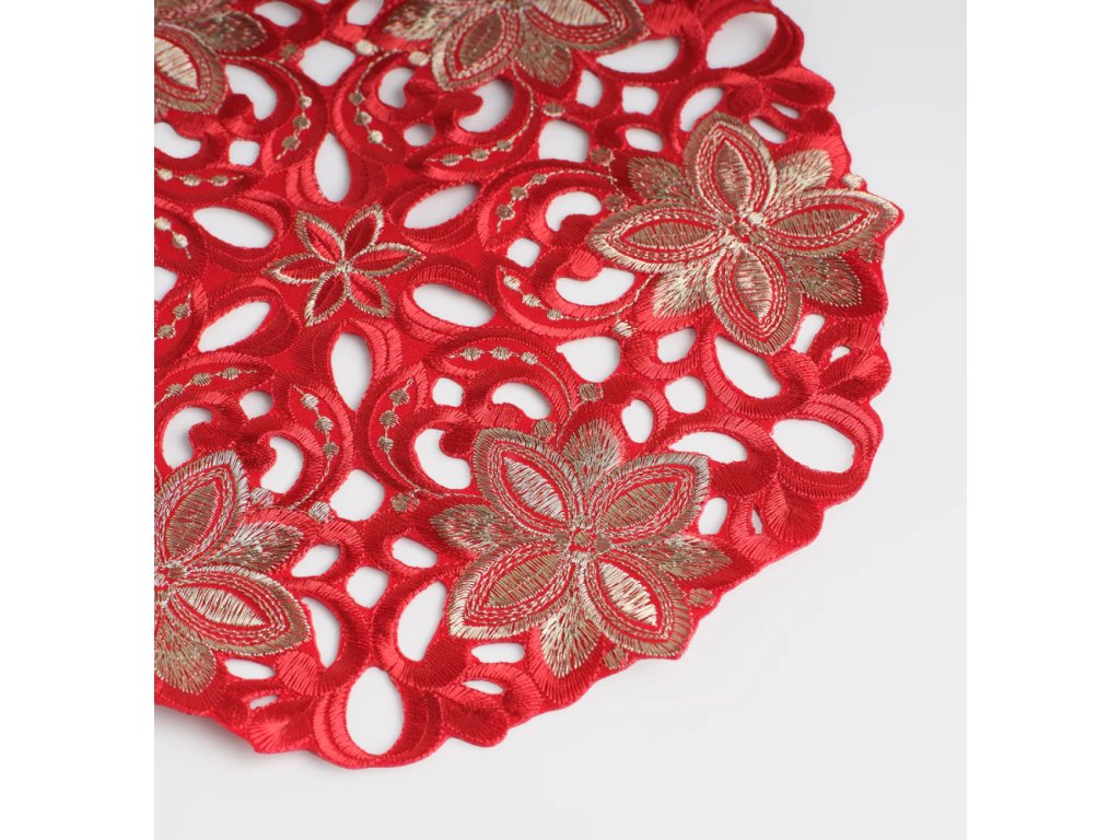 Intenzívna červená farba spojená so zlatou výšivkou a prelamovanou štruktúrou dodáva obrúsku Recor neopakovateľný, elegantný charakter.