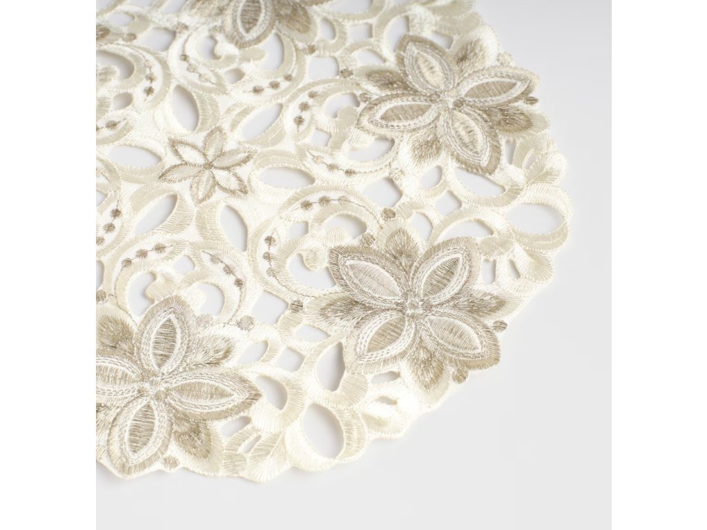 Dekoratívny kvetinový motív vo svetlom odtieni ecru dodáva obrúsku výnimočnú eleganciu.