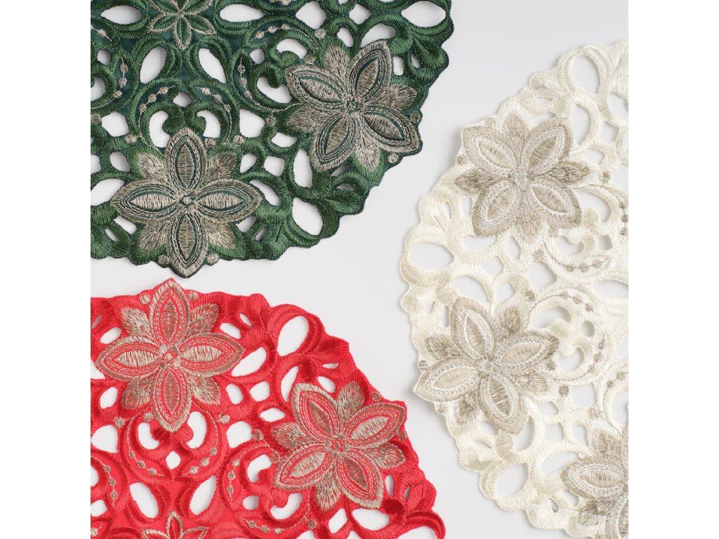 Obrúsok je príjemný na dotyk, jemne lesklý a vyhotovený precíznou výšivkou, ktorá podčiarkuje jeho výnimočný charakter.