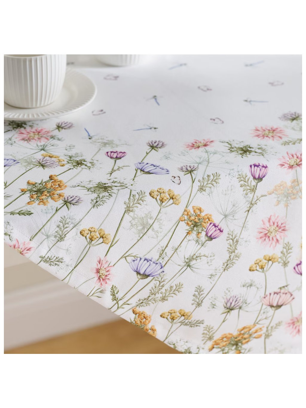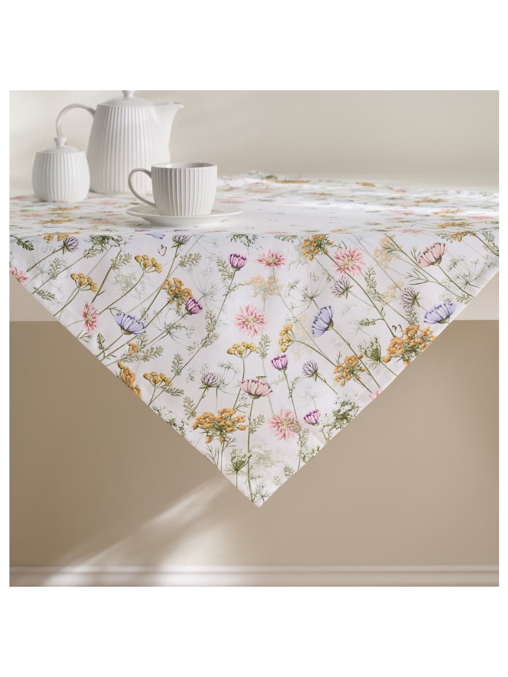 Biely obrúsok s dekoratívnou kvetinovou potlačou Koperino je vynikajúcou voľbou do interiérov zariadených v prírodnom štýle.