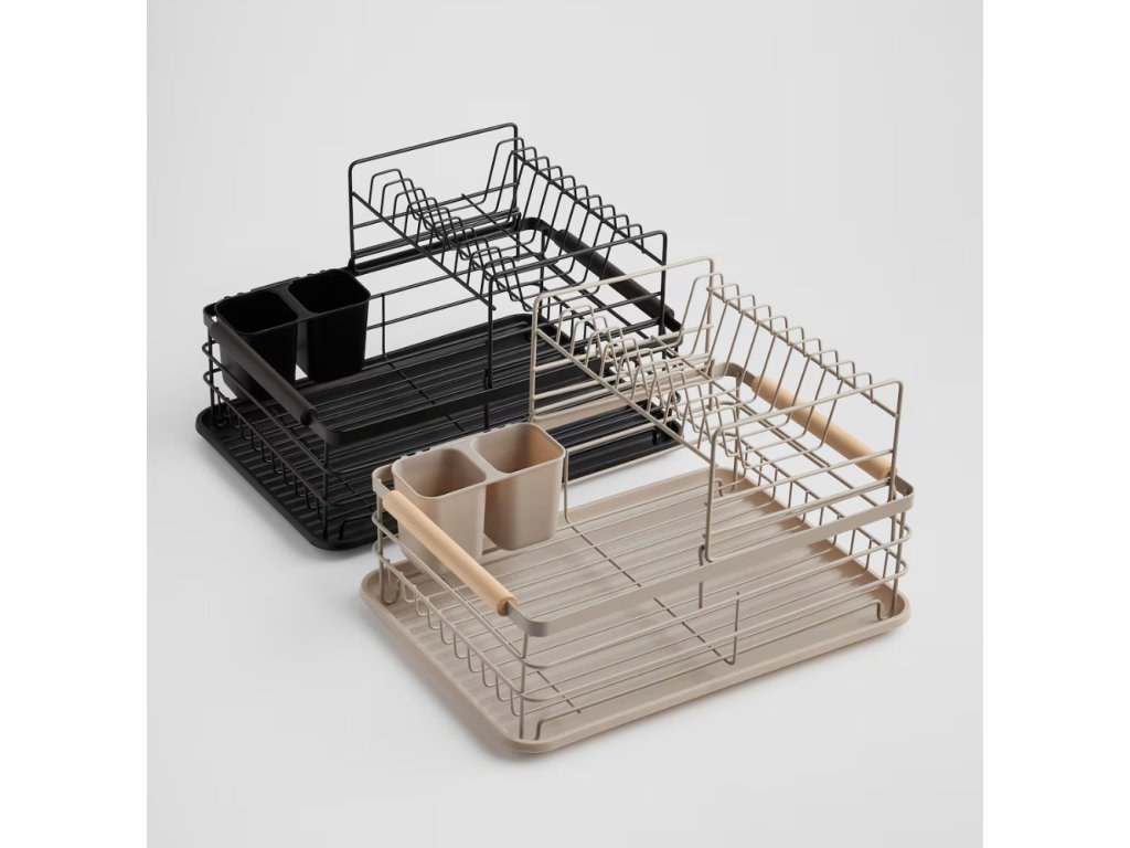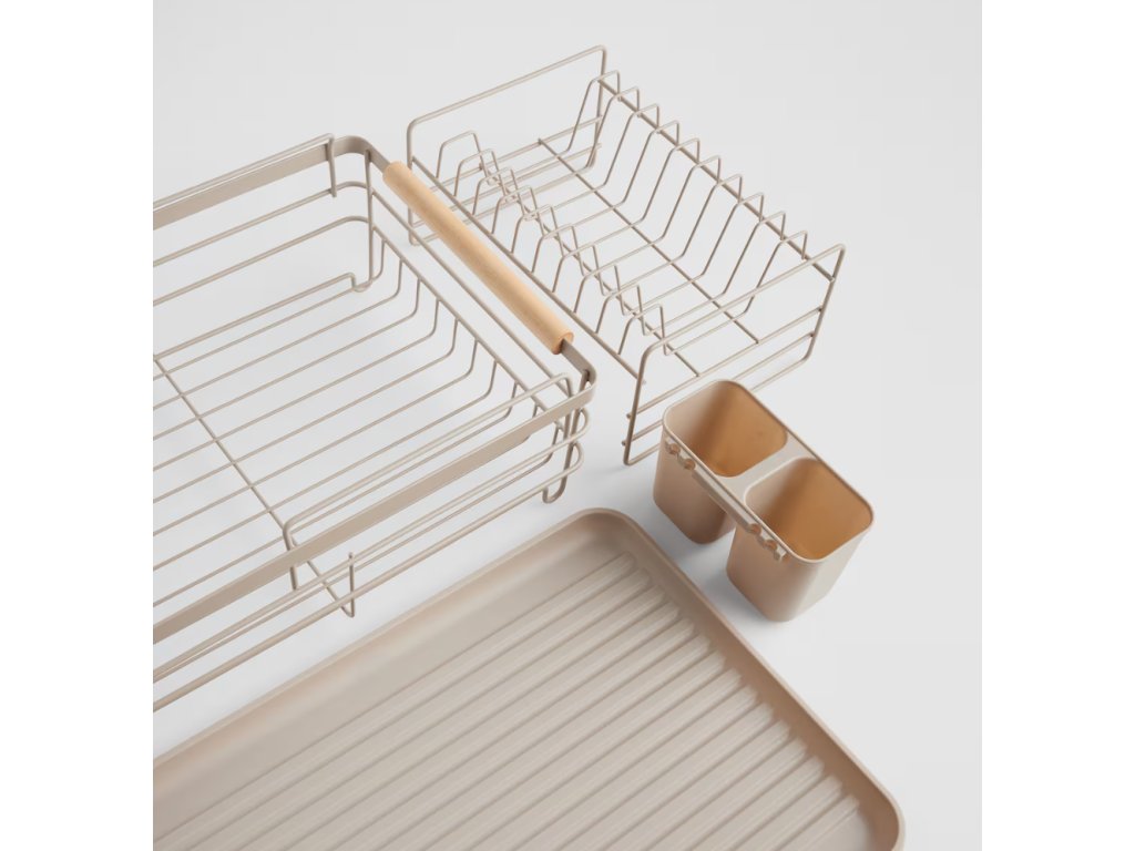 Odkvapkávač na riad Ardilas je ideálnou kombináciou industriálneho štýlu a maximálnej funkčnosti . Je vyrobený z odolného kovu v matnej béžovej farbe, doplnený o praktické detaily z dreva a plastu . Dvojúrovňová konštrukcia poskytuje dostatok miesta na taniere a šálky, zatiaľ čo odnímateľné priehradky slúžia na príbory a kuchynské náčinie . Matné spracovanie a čisté línie kovu v béžovom odtieni dodajú vašej kuchyni moderný a elegantný industriálny akcent . V balení nájdete 3 prvky – hlavný kovový odkvapkávač, spodnú plastovú tácku a držiaky na príbory