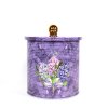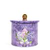 Táto okrúhla kovová dóza s odnímateľným vekom má fialový podklad s jemným kvetinovým vzorom (pravdepodobne orgován alebo hortenzie) a textovým prekrytím. Zlatá úchytka na veku dodáva šarm. Je ideálna na uskladnenie drobností alebo ako romantický dekoračný prvok.
