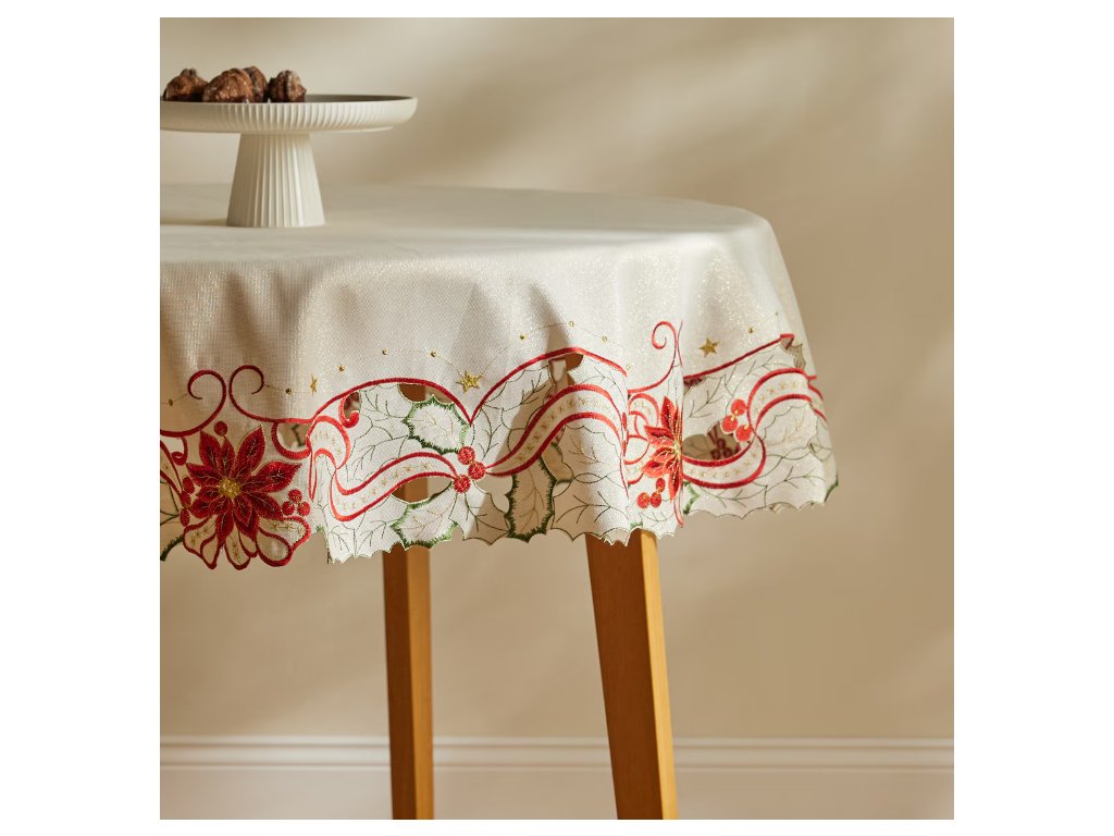 Krémový odtieň obrusu jemne rozjasňuje interiér a výrazná výšivka so sviatočným motívom dodáva lesk každej aranžácii.