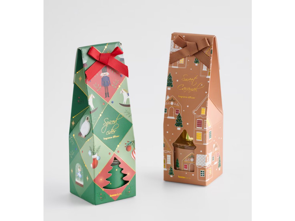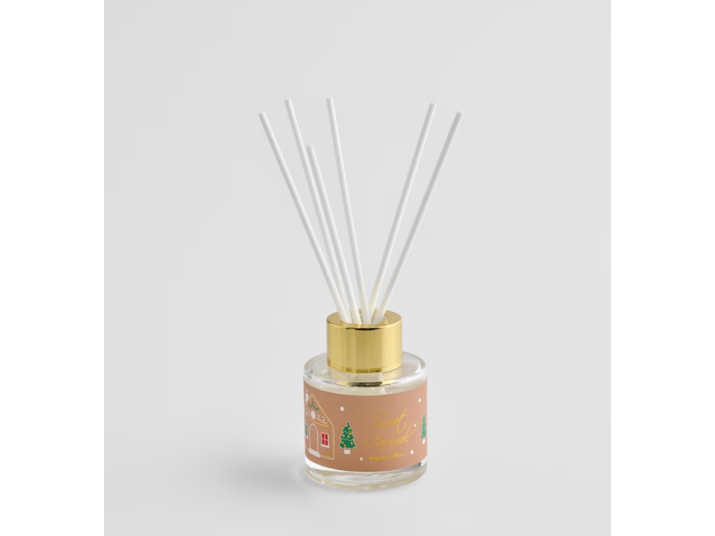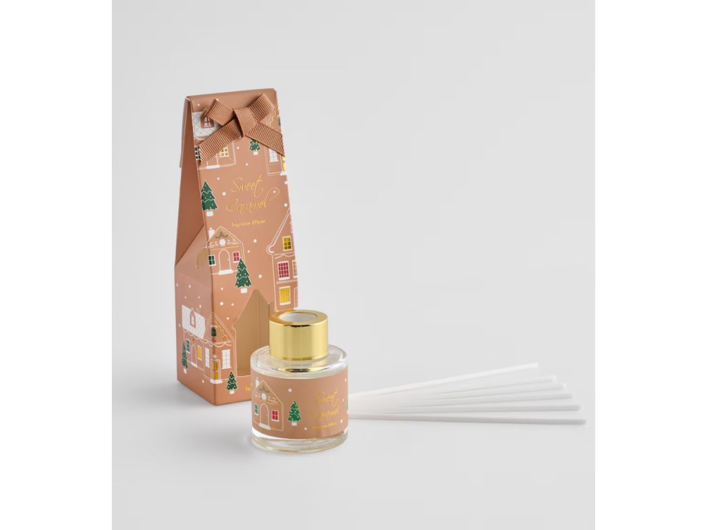 Zahaľte svoj domov do hrejivej a lákavej arómy karamelu s týmto pôvabným izbovým difuzérom, ktorý je zabalený ako malý sviatočný darček. Osviežovač Sweet Caramel sa nachádza v elegantnej kartónovej krabičke s motívom medovníkových domčekov a vianočných stromčekov. Vrch krabičky je ozdobený béžovou mašľou a má tvar komína, čo umocňuje dojem rozprávkového domčeka. Vo vnútri sa nachádza sklenená nádoba s vôňou s objemom približne 40ml a elegantným zlatým uzáverom, ktorá po vložení priložených tyčiniek uvoľňuje intenzívnu sladkú vôňu karamelu. Tento difuzér je dokonalým spojením tradičného sviatočného štýlu a príjemnej, dlhotrvajúcej vône.