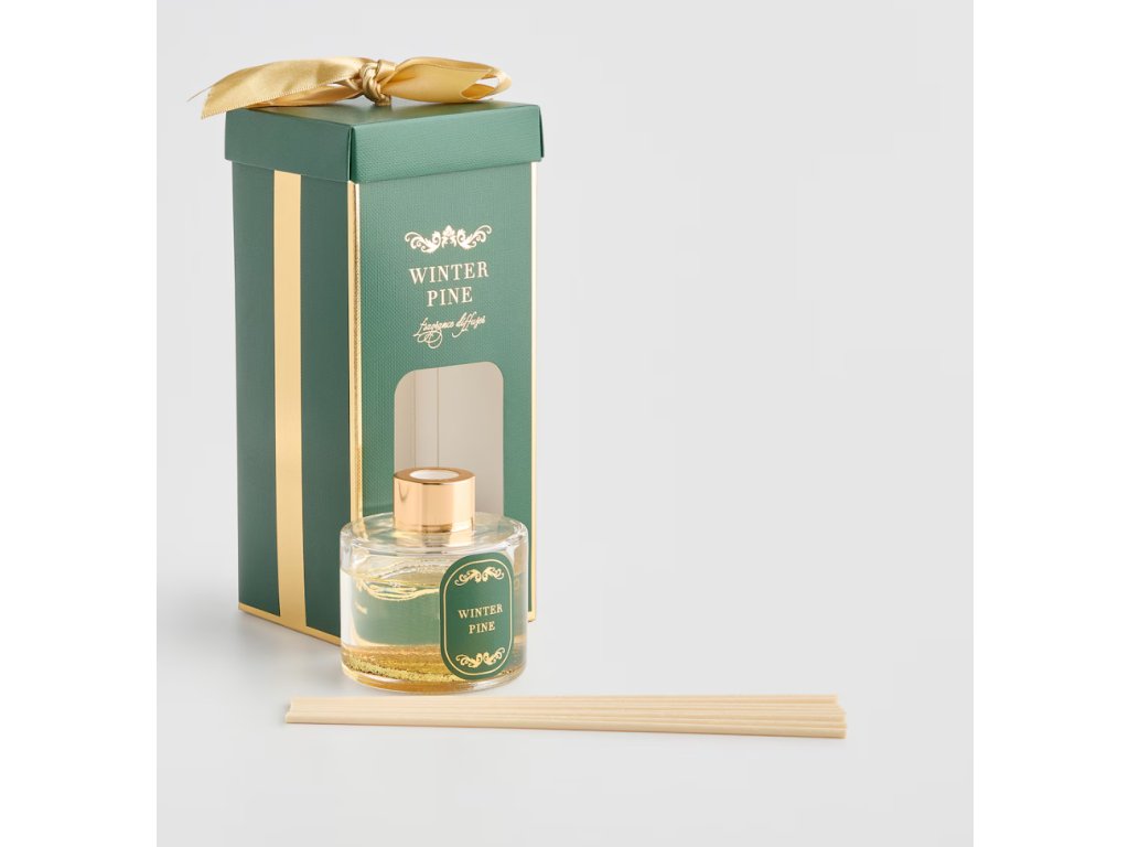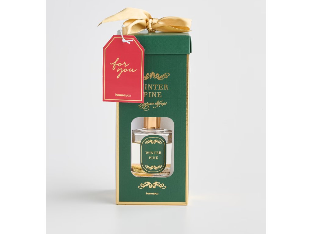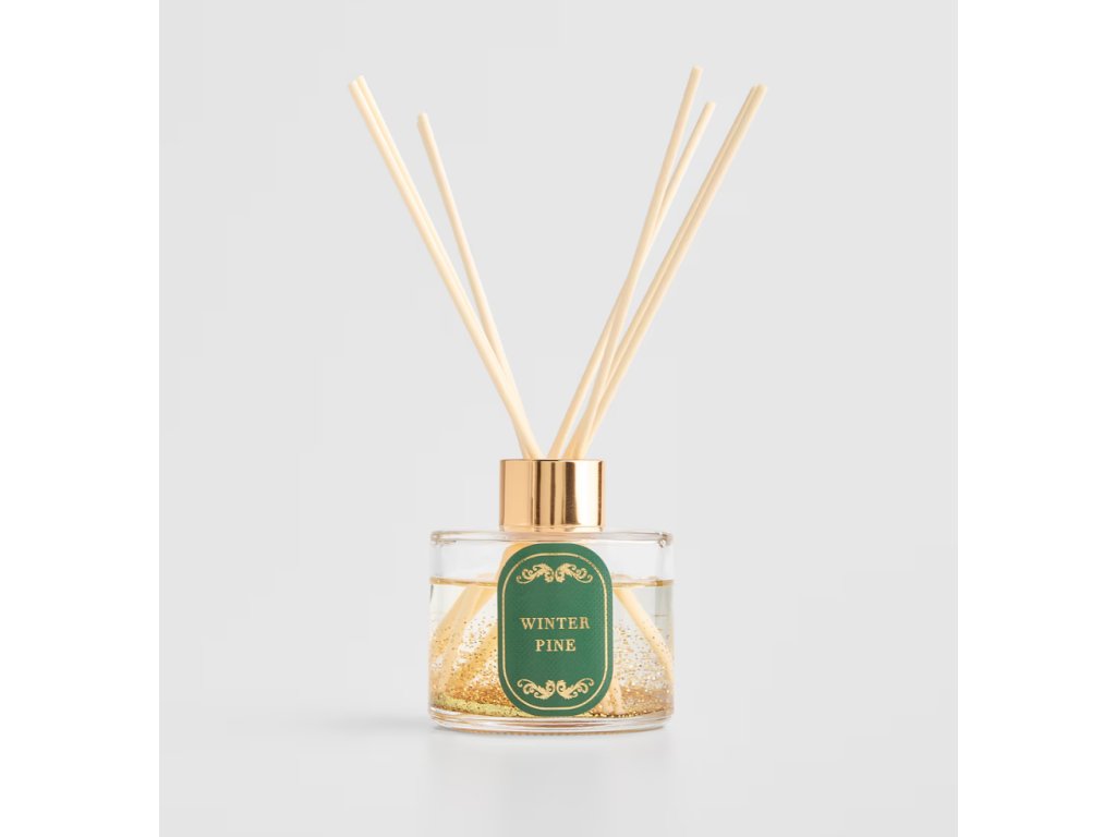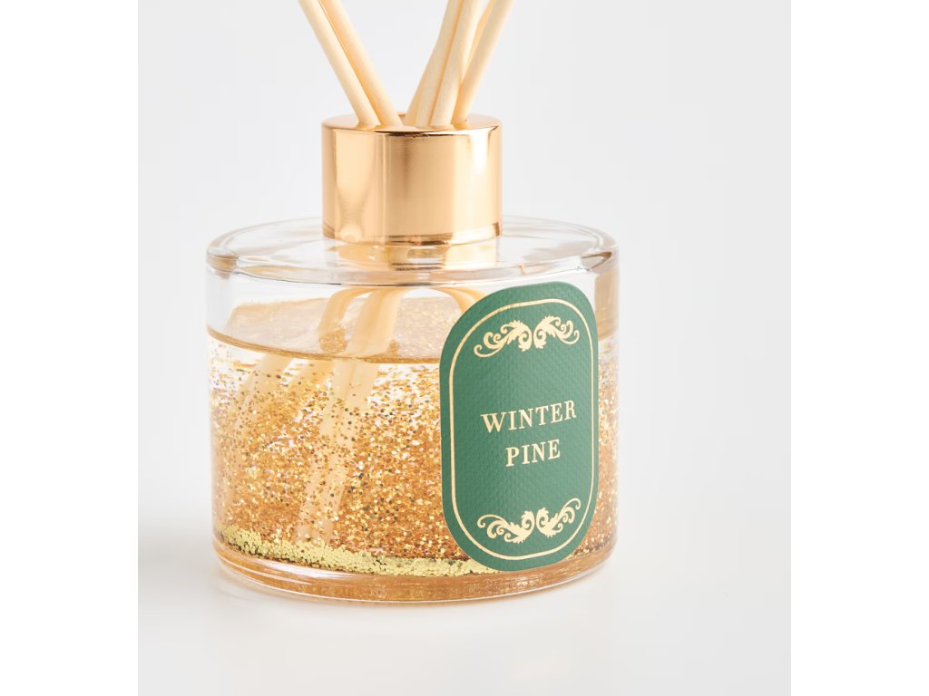 Vytvorte si vo svojom domove kúzelnú, sviatočnú atmosféru s týmto elegantným difuzérom, ktorý je nielen zdrojom podmanivej vône, ale aj luxusnou dekoráciou. Sklenená fľaštička s lesklým zlatým uzáverom a elegantnou tmavozelenou etiketou v sebe ukrýva vonného oleja so sviežou vianočnou arómou Winter Pine (Zimná Borovica/Ihličie). To, čo robí tento difuzér výnimočným, sú zlaté trblietky plávajúce vo vnútri, ktoré nádherne žiaria a rozprúdia lesk v každom priestore. Bambusové tyčinky zaisťujú postupné uvoľňovanie vône. Je ideálny ako štýlový doplnok do obývačky, spálne, alebo ako žiarivý vianočný darček.