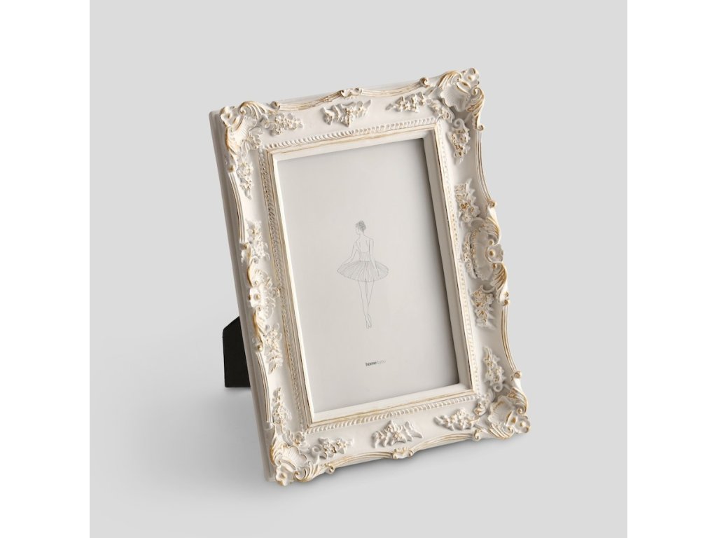 Elegantný rámik v bielej farbe, ozdobený jemným kvetinovým motívom. Je určený na jednu fotografiu s rozmermi 10 cm x 15 cm. Štýlový dizajn zaisťuje, že sa dokonale hodí ku klasickým a romantickým interiérovým aranžmánom. Ideálny ako darček alebo ako decentná domáca dekorácia.