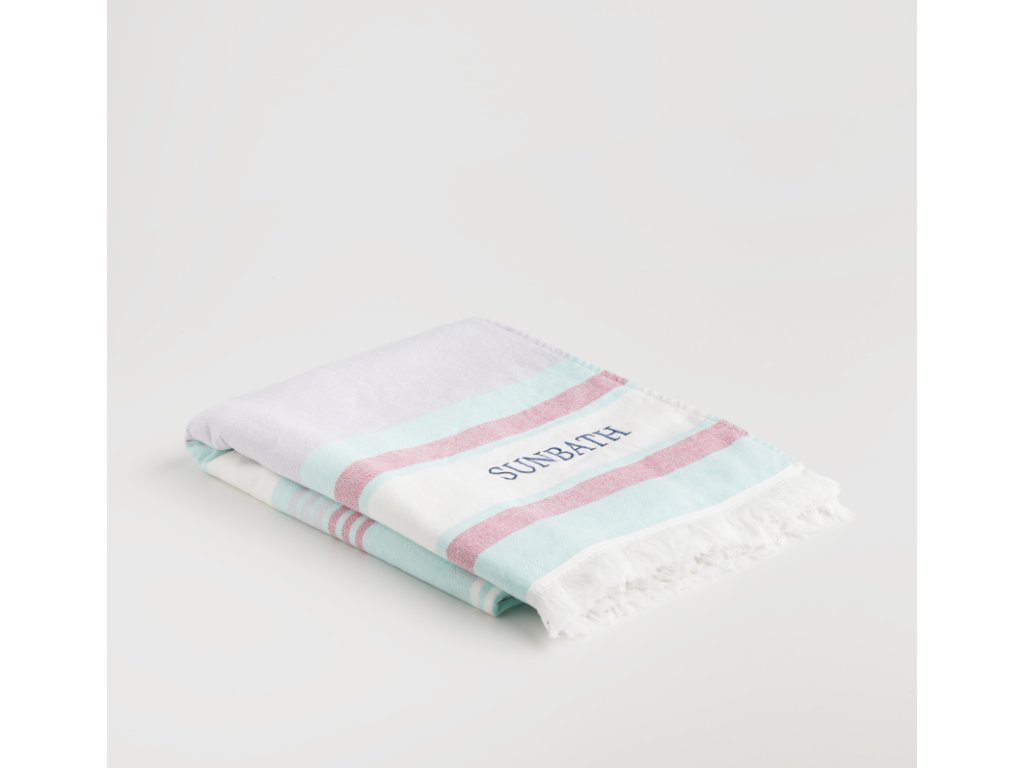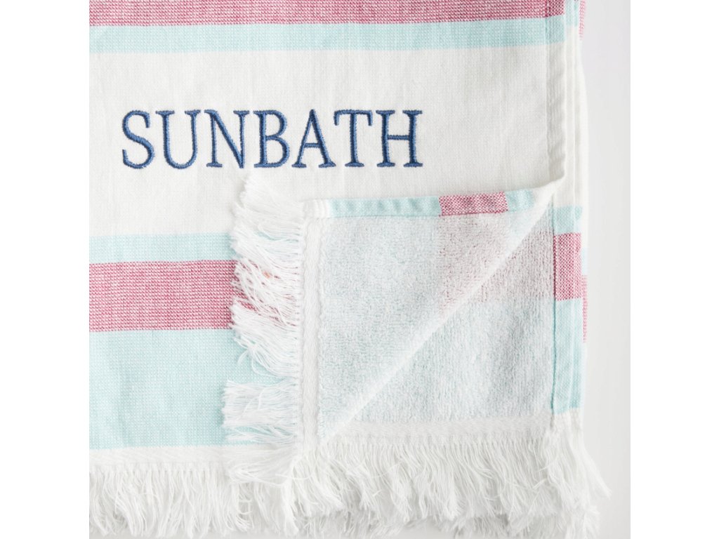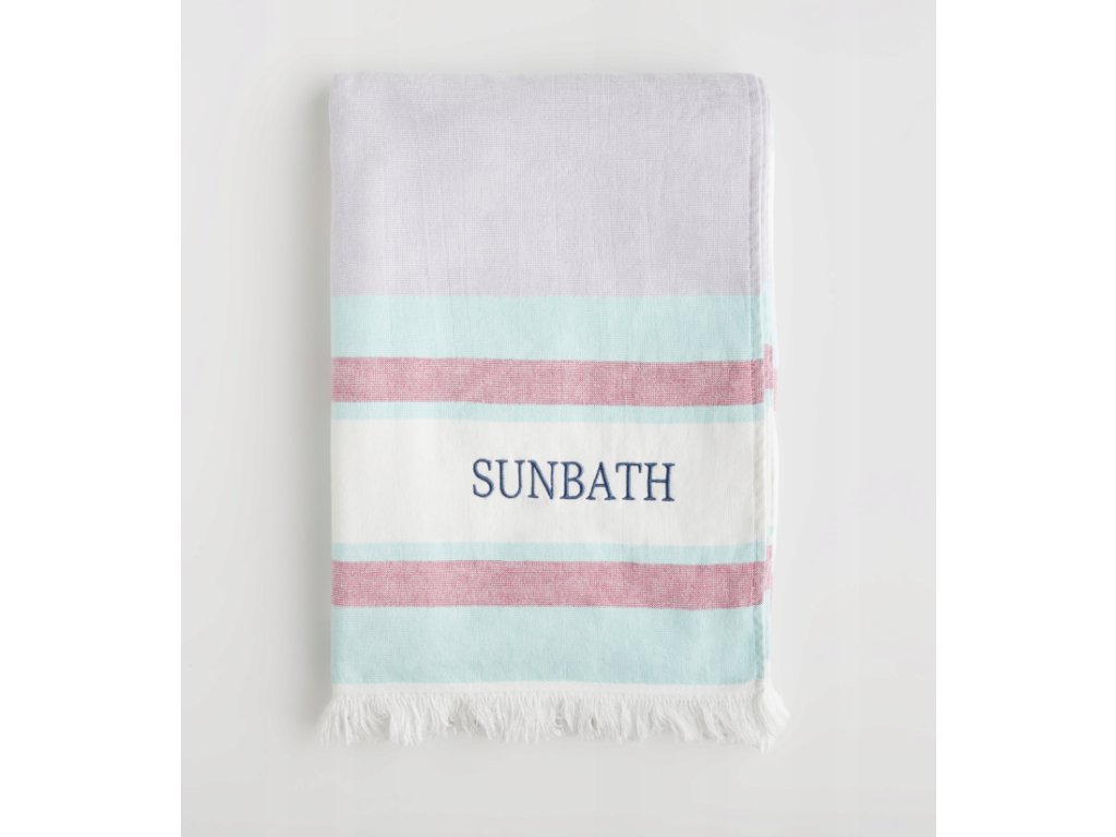 Pruhovaná plážová osuška, ktorá spája moderný štýl s funkčnosťou. Má jemné pastelové farby – svetlofialovú a mätovú – prekladané výraznejšími bordovými pásikmi, čo vytvára svieži a letný vzhľad. V strede osušky je vyšitý nápis "SUNBATH", ktorý podčiarkuje jej účel. Okraje sú zakončené strapcami, ktoré jej dodávajú ležérny a bohémsky nádych. Je ideálna na leňošenie na pláži alebo pri bazéne a zároveň poslúži ako štýlový doplnok.