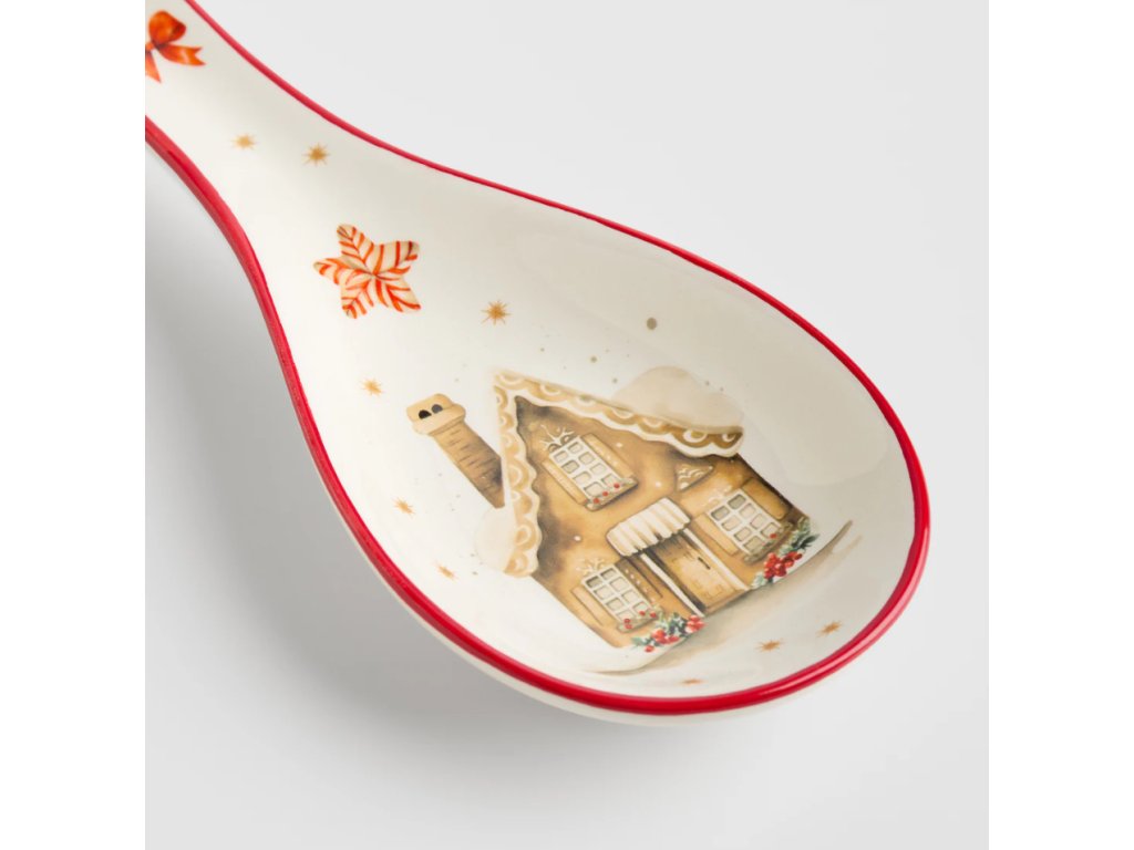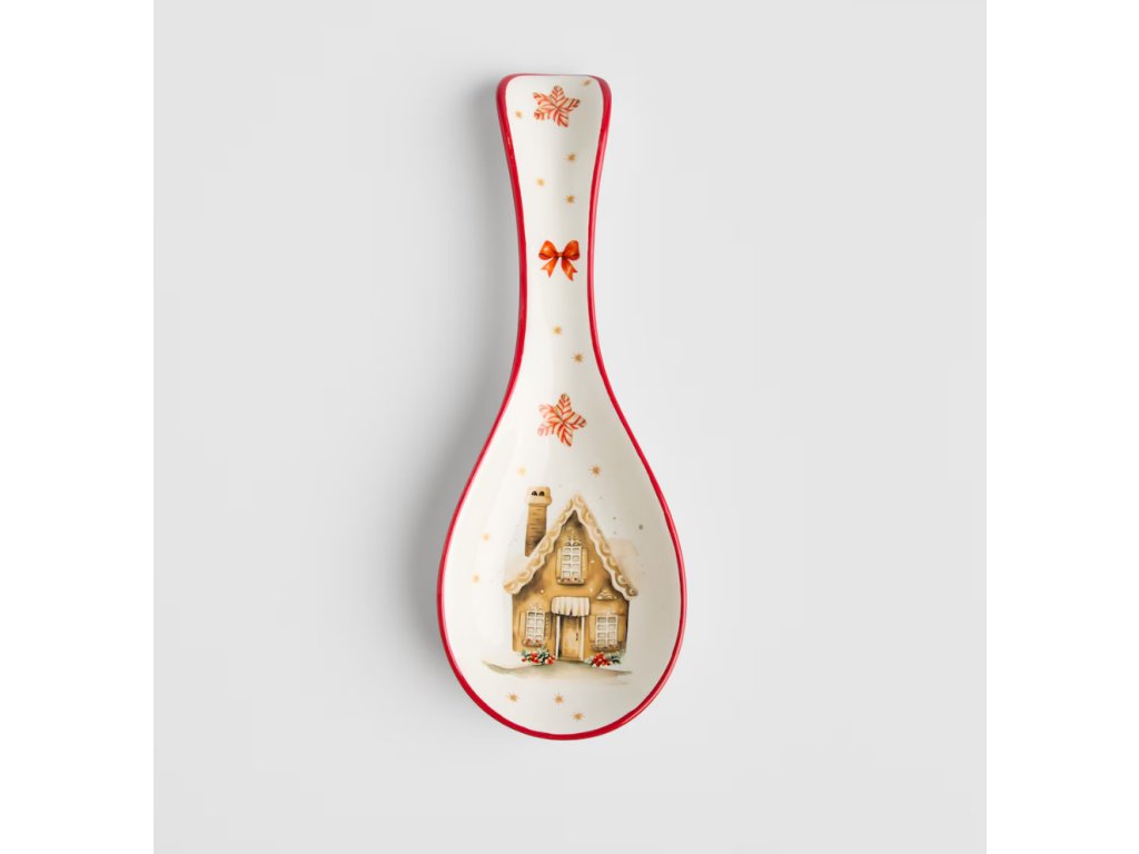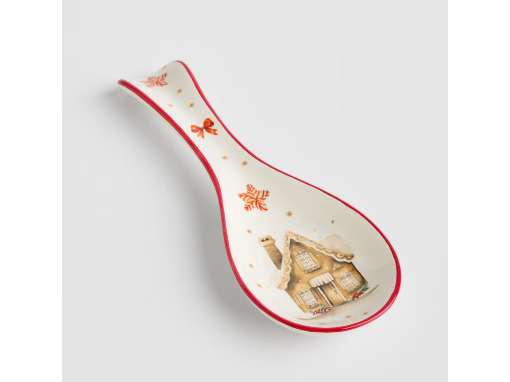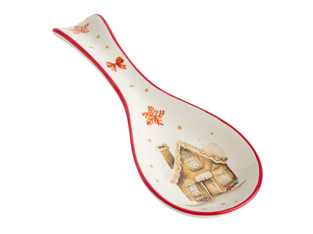 Pripravte sa na sviatočné pečenie a varenie s touto rozkošnou keramickou podložkou pod lyžicu. Je vyrobená z dolomitu a má ideálnu dĺžku 25,5 cm. Slúži na ochranu vašej kuchynskej linky alebo sporáka pred znečistením. Podložka v tradičnom štýle je ručne dekorovaná a má jemný krémovo-biely základ, ktorý dopĺňa sýto červený okraj. Ústredným motívom je čarovný, zasnežený perníkový domček, obklopený hviezdami a vianočnými mašličkami. Táto podložka nie je len praktickým pomocníkom, ale aj veselým a milým viacfarebným dekoračným prvkom, ktorý vnesie teplo vianočnej kuchyne do vášho domova.