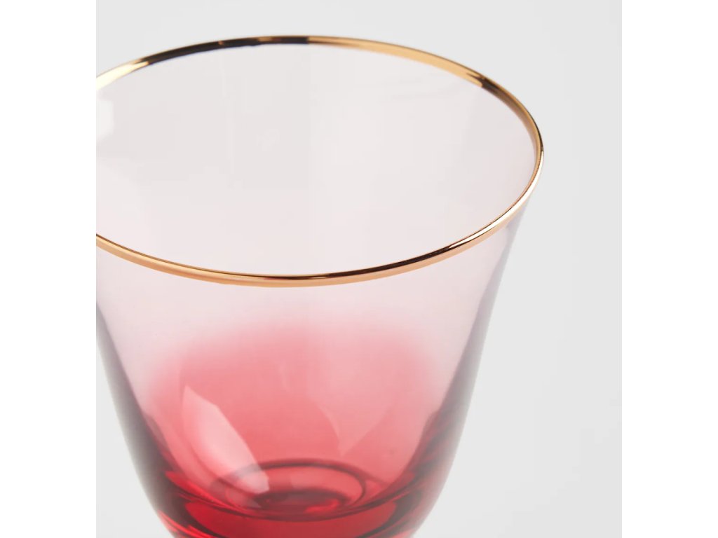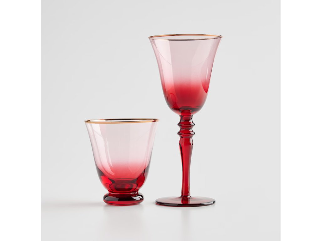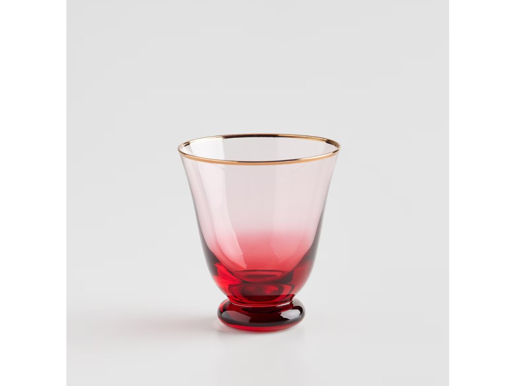 Tento elegantný červený pohár so zlatým okrajom je stelesnením štýlu a luxusu. Jeho sýta červená farba, ktorá sa smerom hore jemne prechádza do svetlejšieho odtieňa, v kombinácii s decentným zlatým lemom na okraji, dodáva každému nápoju slávnostný nádych. Ideálny pre špeciálne príležitosti alebo ako luxusný doplnok na vylepšenie každodenného stolovania. Vyrobený z kvalitného sodného skla, s kompaktnými rozmermi a objemom 290ml, je dokonalou voľbou pre víno, koktaily, alebo len vodu s elegantným nádychom.