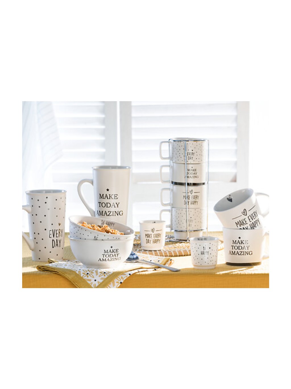 Začnite svoj deň s úsmevom a dávkou motivácie! Hrnčeky z kolekcie Happy sú vyrobené z kvalitného porcelánu New Bone, ktorý spája jemnosť s vysokou odolnosťou. Vďaka trom pozitívnym nápisom premenia každú kávu či čaj na malý rituál radosti.