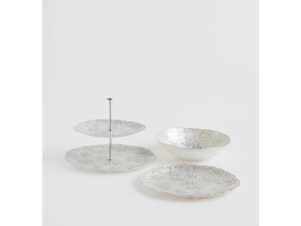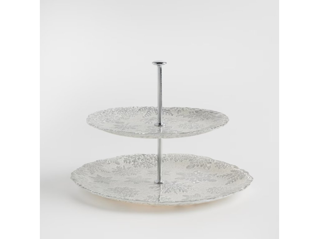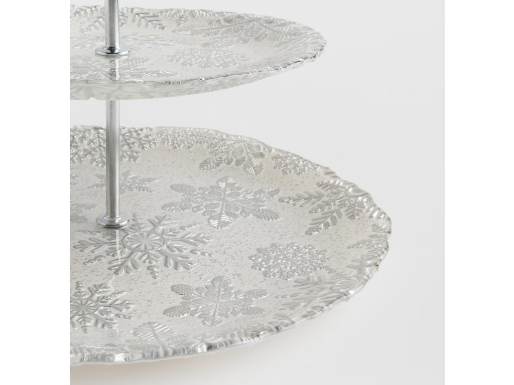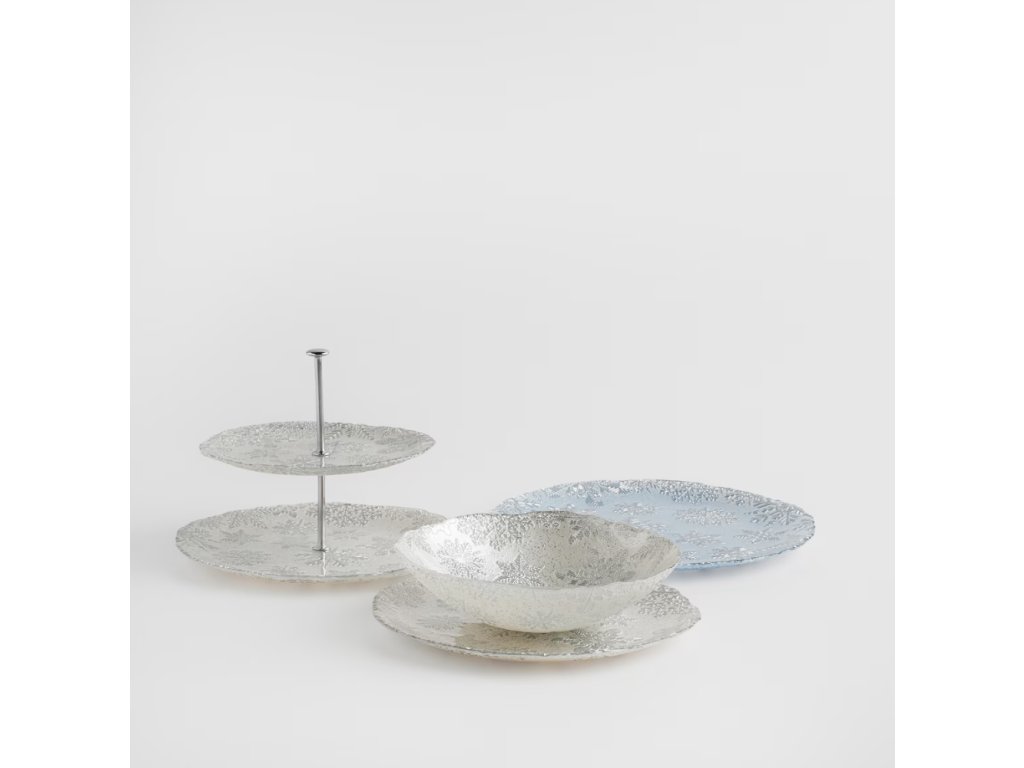 Sviatočná elegancia, ktorá žiari! Poschodový etažér Snowflakes zo strieborného, ručne maľovaného skla s motívom snehových vločiek je dokonalým základom pre Vaše vianočné pohostenie. Vystavte na ňom drobné pečivo, cukrovinky alebo ovocie a premeňte servírovanie na luxusný zážitok v štýle glamour.