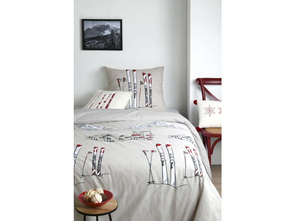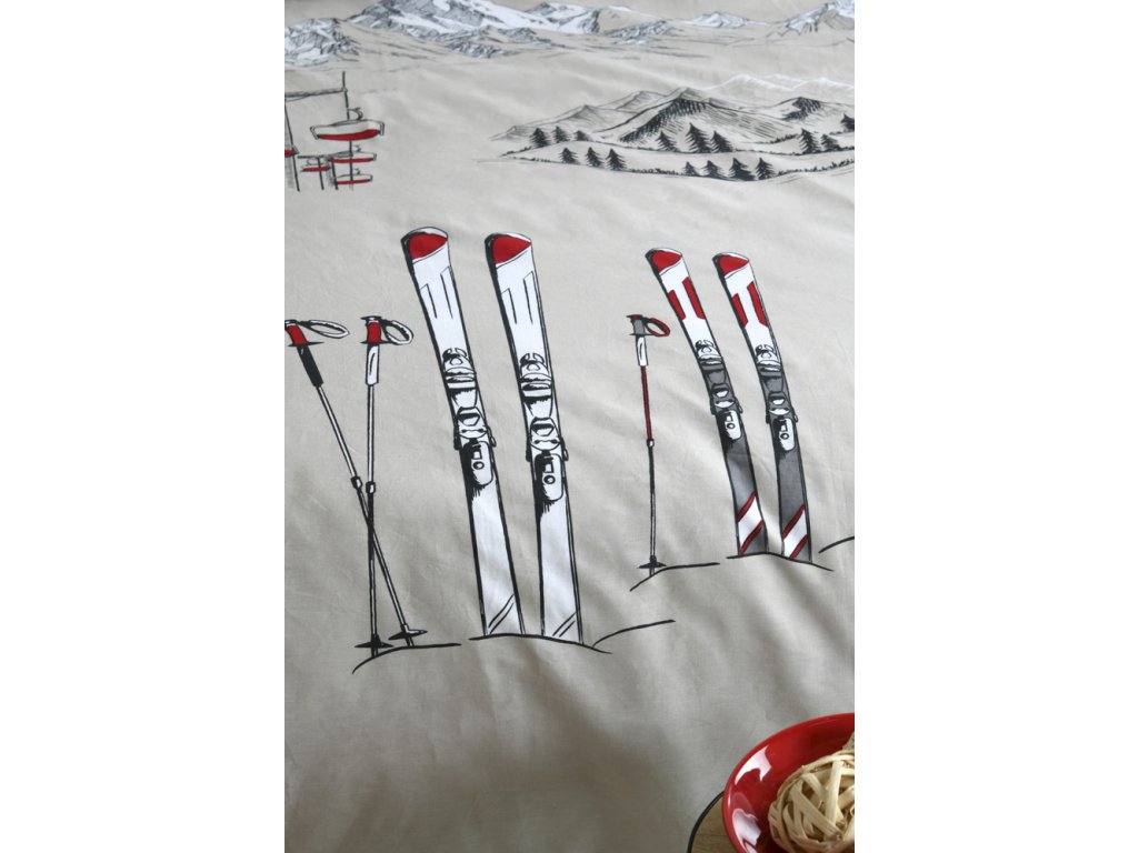 Táto moderná posteľná bielizeň s motívom lyžovania je ideálna pre všetkých milovníkov zimných športov a horskej atmosféry. Jemná béžová farba s kresbami hôr, lyží a lyžiarskych vlekov v kombinácii s červenými akcentmi dodá vašej spálni jedinečný a štýlový vzhľad. Je ideálna na vytvorenie útulnej a inšpiratívnej atmosféry.