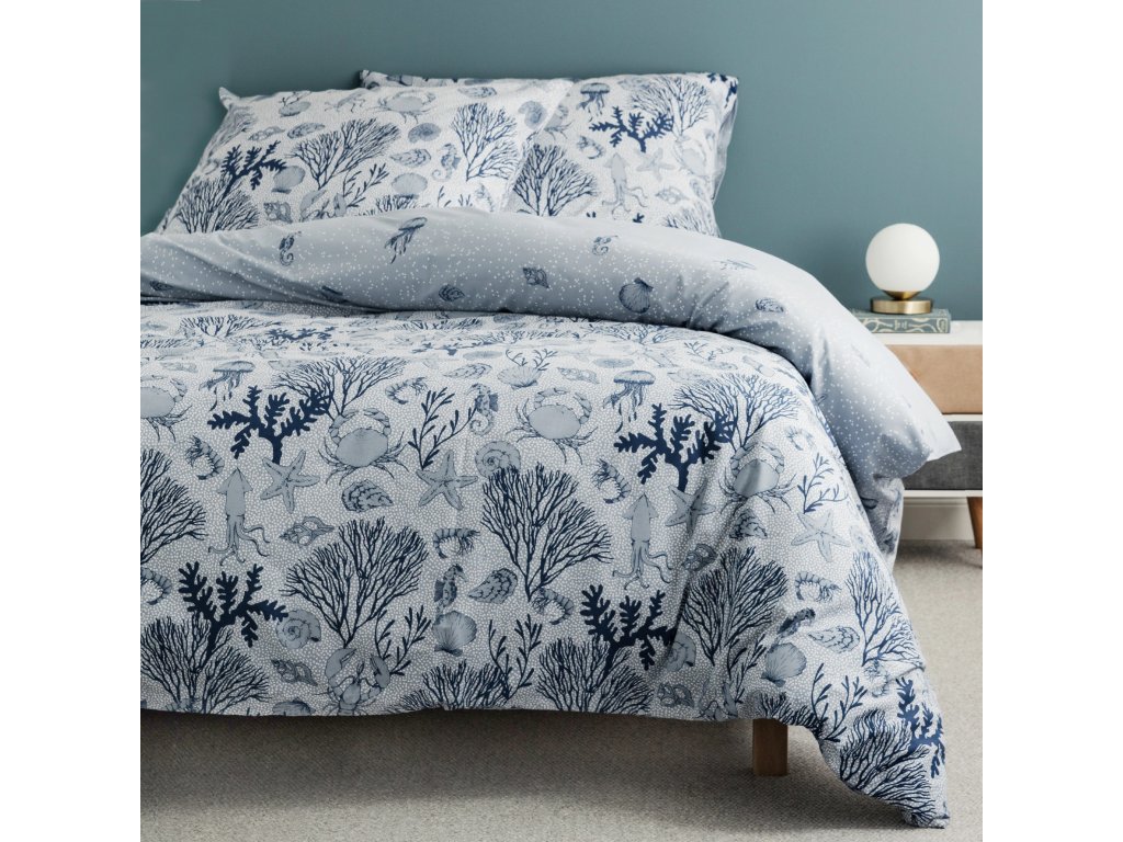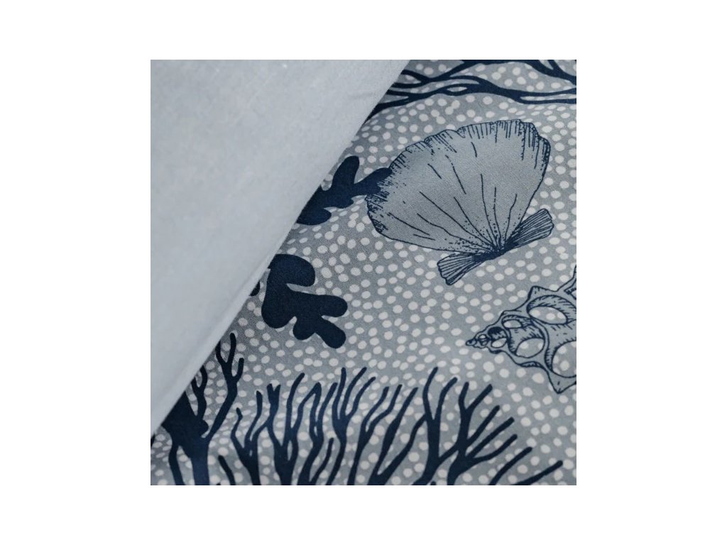 Bavlnená posteľná bielizeň Blue Sotto vytvára námornícku atmosféru. Pastelový, jemný modrý odtieň je pokrytý vzorom malých, blízko seba rozmiestnených bielych bodiek a vodných symbolov, ako sú koralové útesy, kraby, mušle atď.