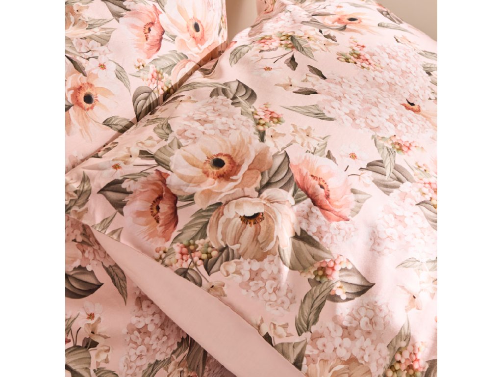 Posteľná bielizeň zo saténovej bavlny v rozmere 200 cm × 200 cm. Vo svetloružovej farbe s jemným kvetinovým vzorom, je mäkká a hladká na dotyk. Zabezpečuje pohodlný spánok a elegantný, decentný akcent v spálni.