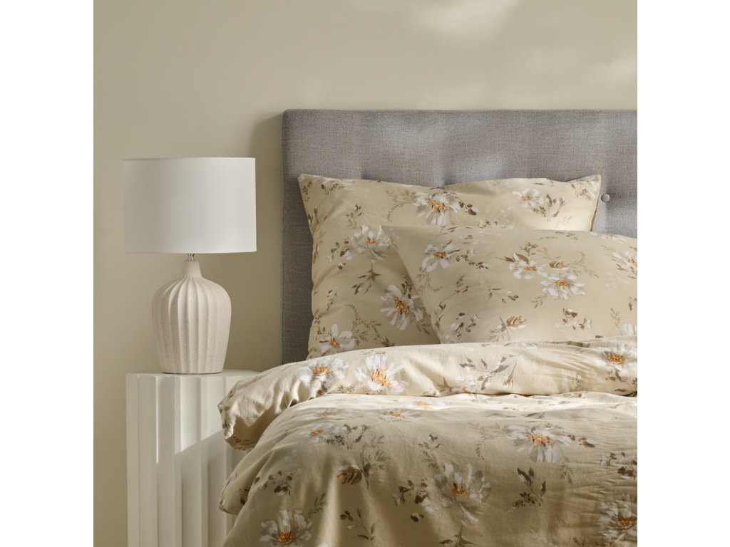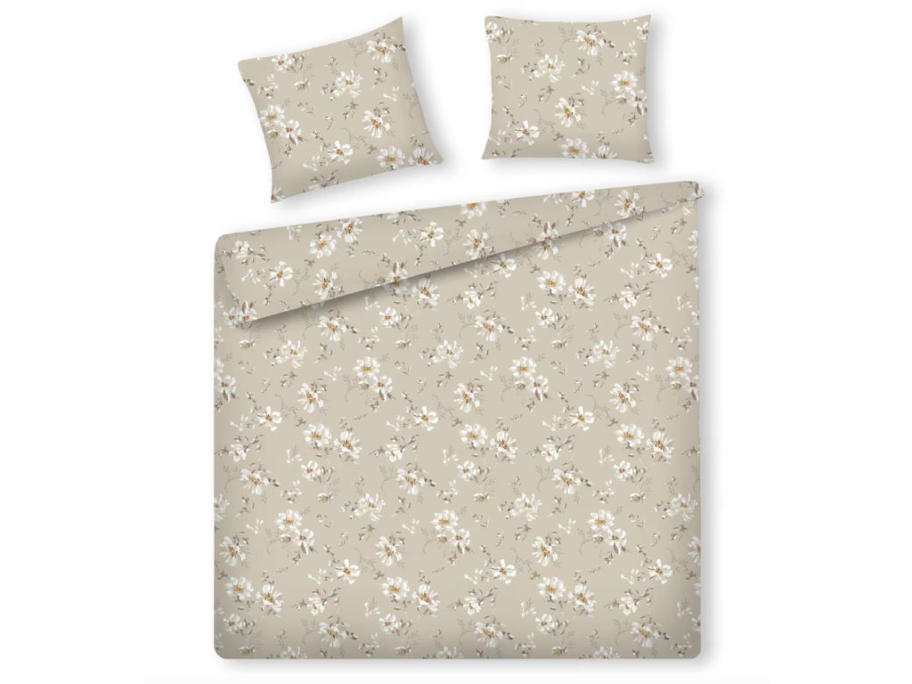 Posteľná bielizeň zo saténovej bavlny s gramážou 120 g/m² v béžovej farbe s kvetinovým vzorom je elegantnou a komfortnou voľbou do spálne. Vo veľkosti 200 x 220 cm očarí mäkkosťou, jemným leskom a decentným, prírodným motívom, ktorý dodáva interiéru teplý a útulný charakter.