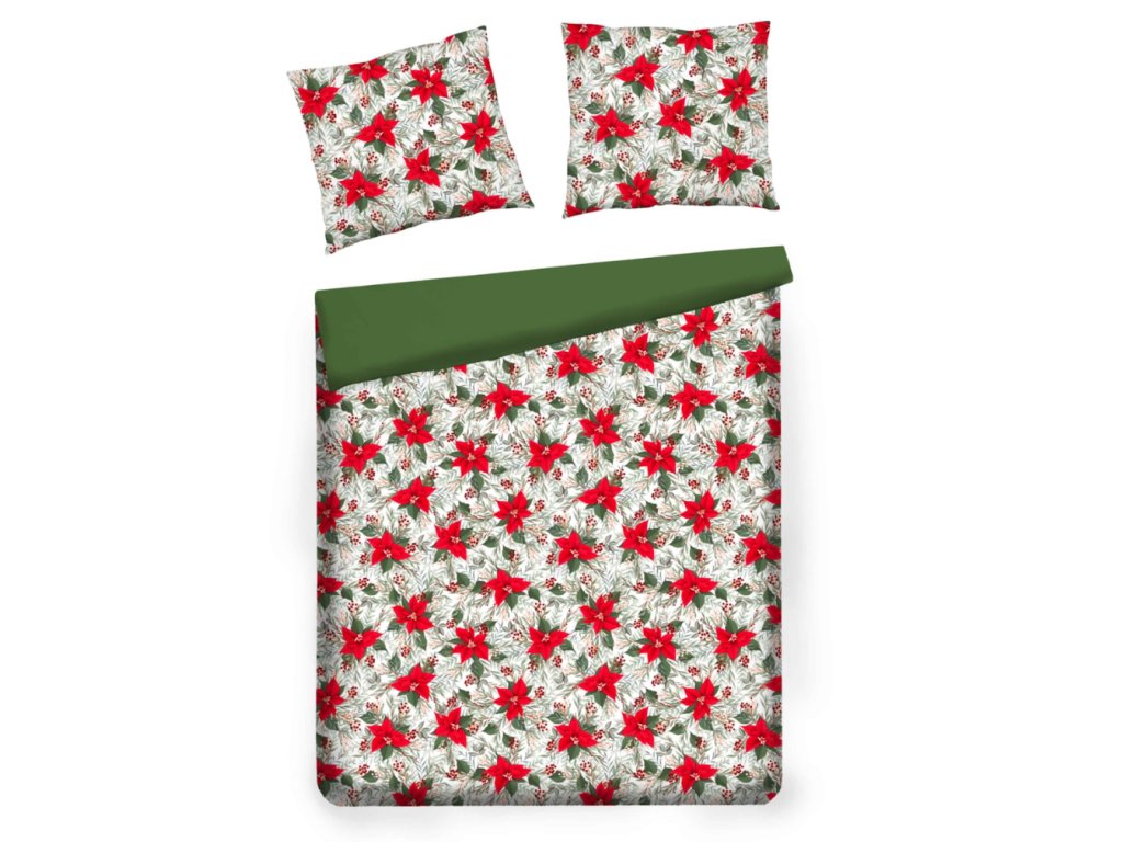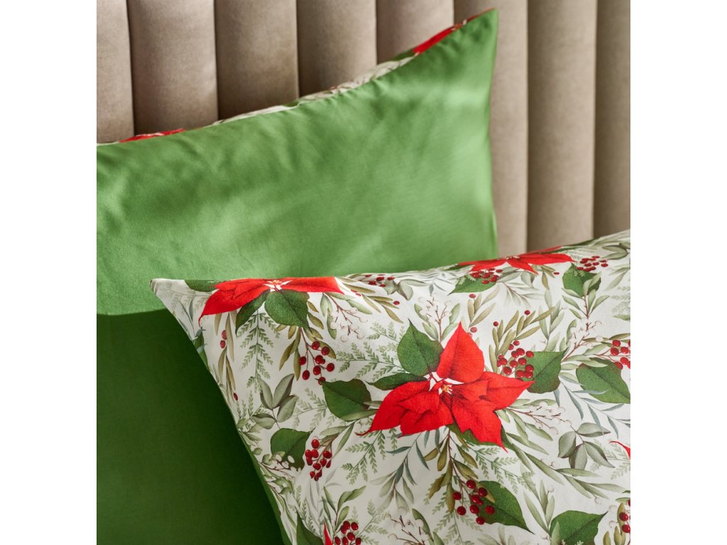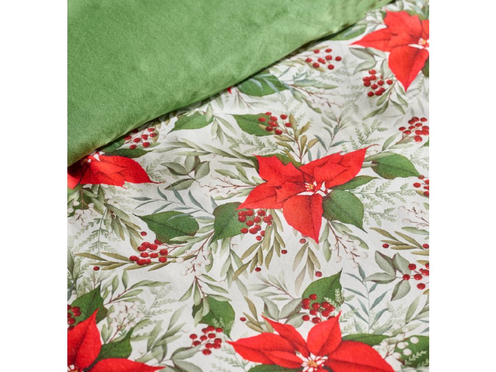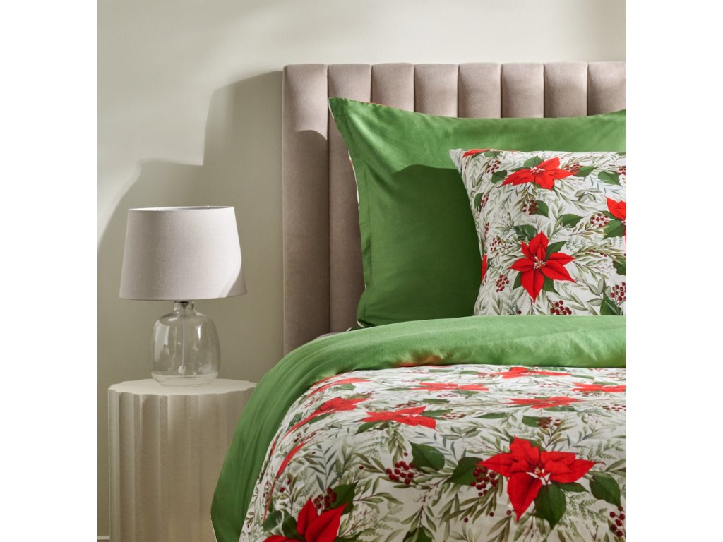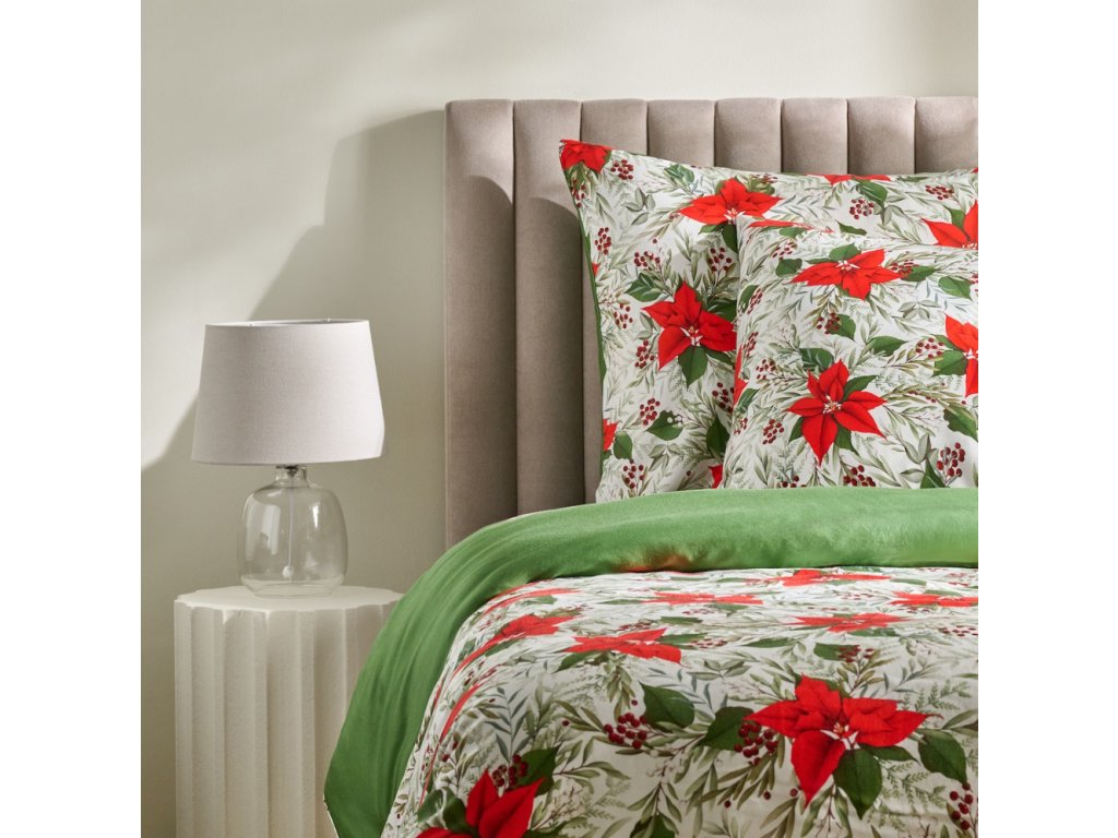 Krémové pozadie posteľnej bielizne zdobia výrazné červené kvety vianočnej hviezdy (poinsettia), zelené listy a jemné bobuľky, vytvárajúc elegantný, vianočný vzhľad. Ozdobný vzor vnáša teplo a radostnú atmosféru do každej spálne. Univerzálna farebnosť sa dokonale skombinuje s modernými, klasickými a škandinávskymi interiérmi. Je to taktiež krásna voľba na štýlový vianočný darček.