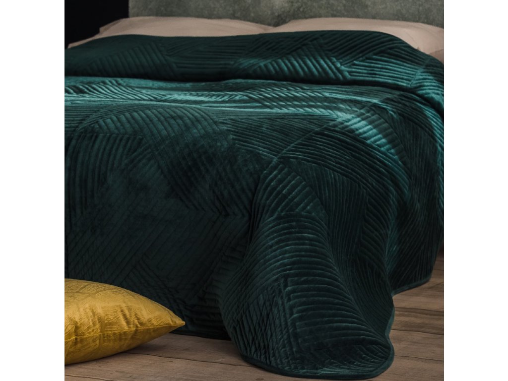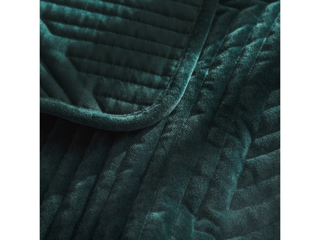 Predná strana prehozu je mäkký a veľmi príjemný materiál na dotyk, s textúrou pripomínajúcou elegantný velúr (zamat). Z druhej strany je všitá hladká tkanina v rovnakej farbe a celok je spojený vkusným prešívaním v módnom geometrickom vzore.