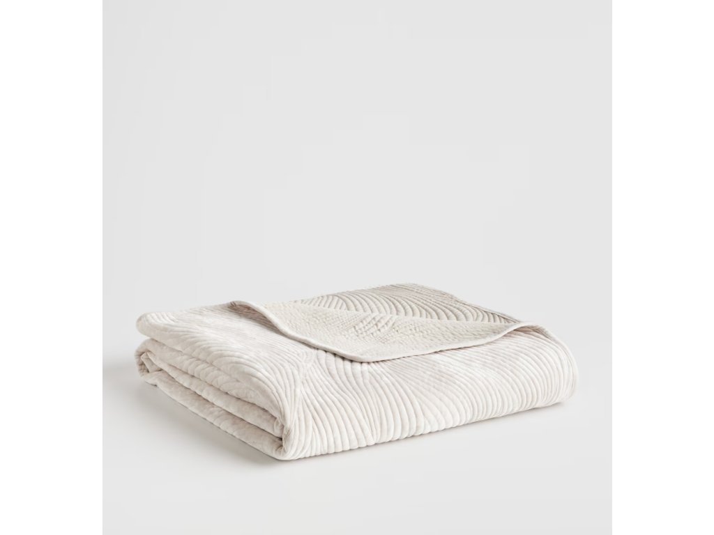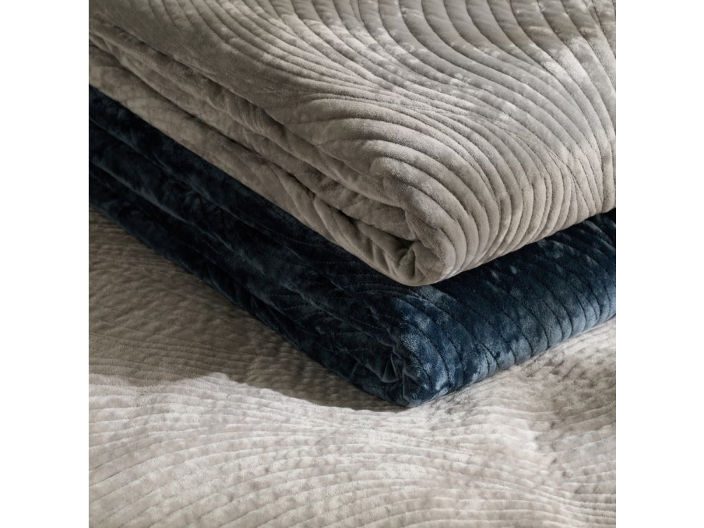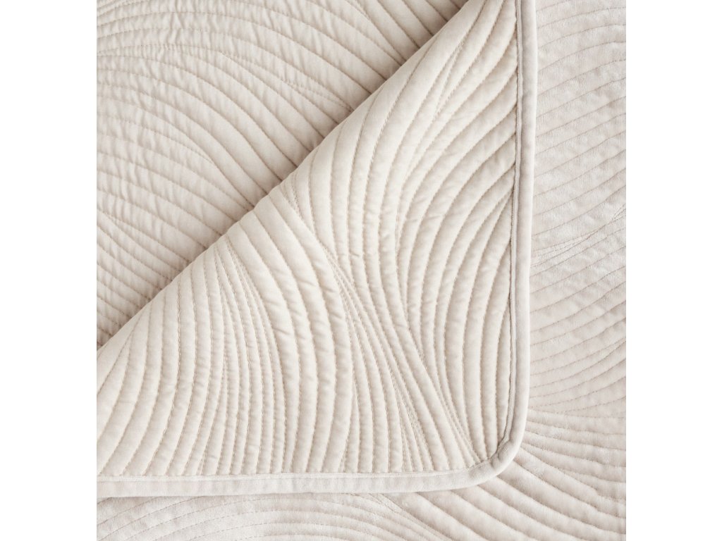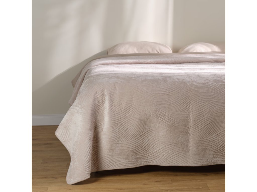 Prikrývka zo zamatu a polyesteru v svetlobéžovej farbe je mäkkým a elegantným doplnkom do spálne alebo obývacej izby. Je ideálna na dekoráciu postele alebo gauča a spája pohodlie pri používaní s jemným, štýlovým vzhľadom.