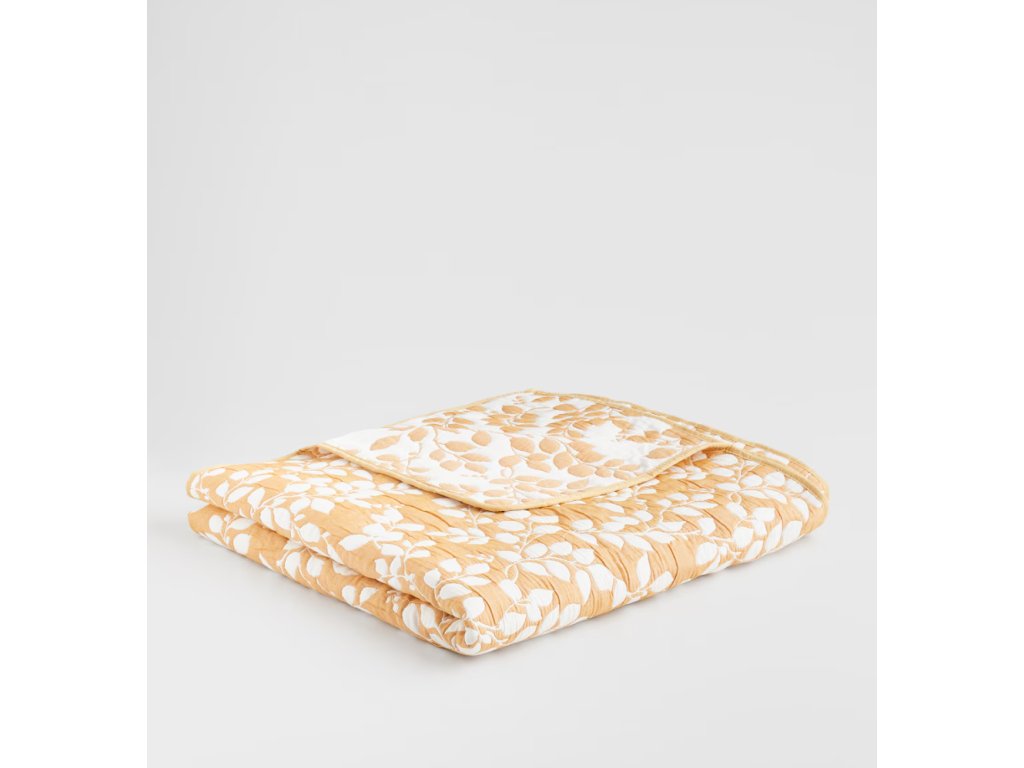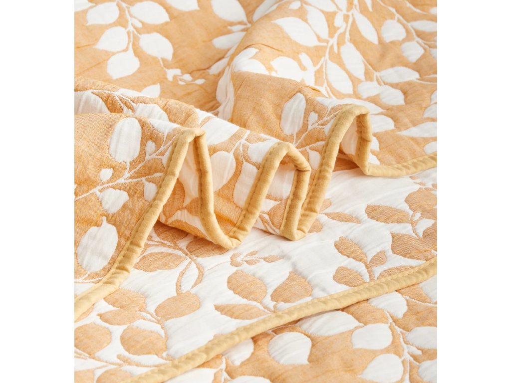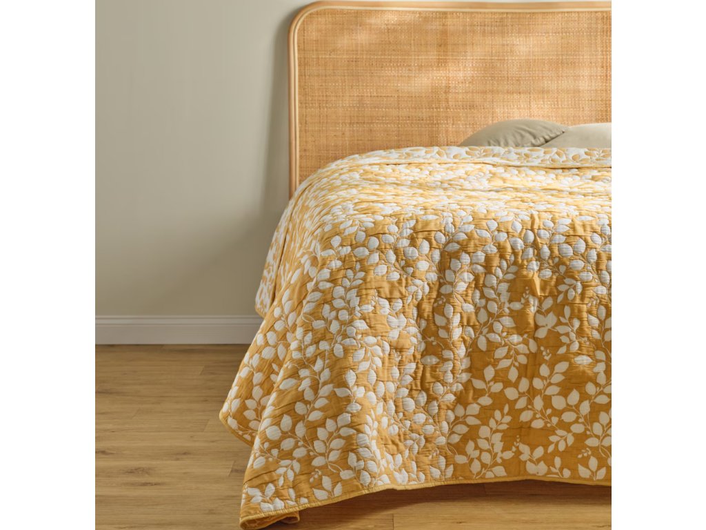 Prehoz vyrobený z kombinácie polyesteru a bavlny v intenzívnej tmavožltej farbe s rastlinným motívom, s rozmermi 200 x 220 cm a gramážou 340 g/m², je štýlový a praktický dekoračný prvok do spálne alebo obývačky.