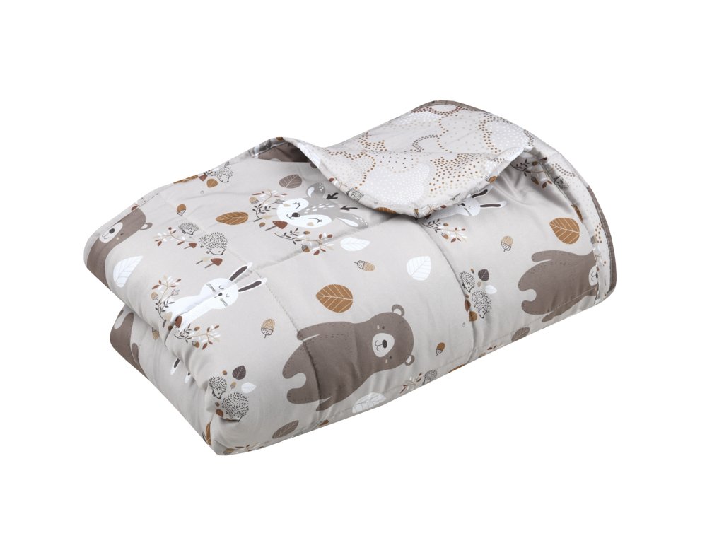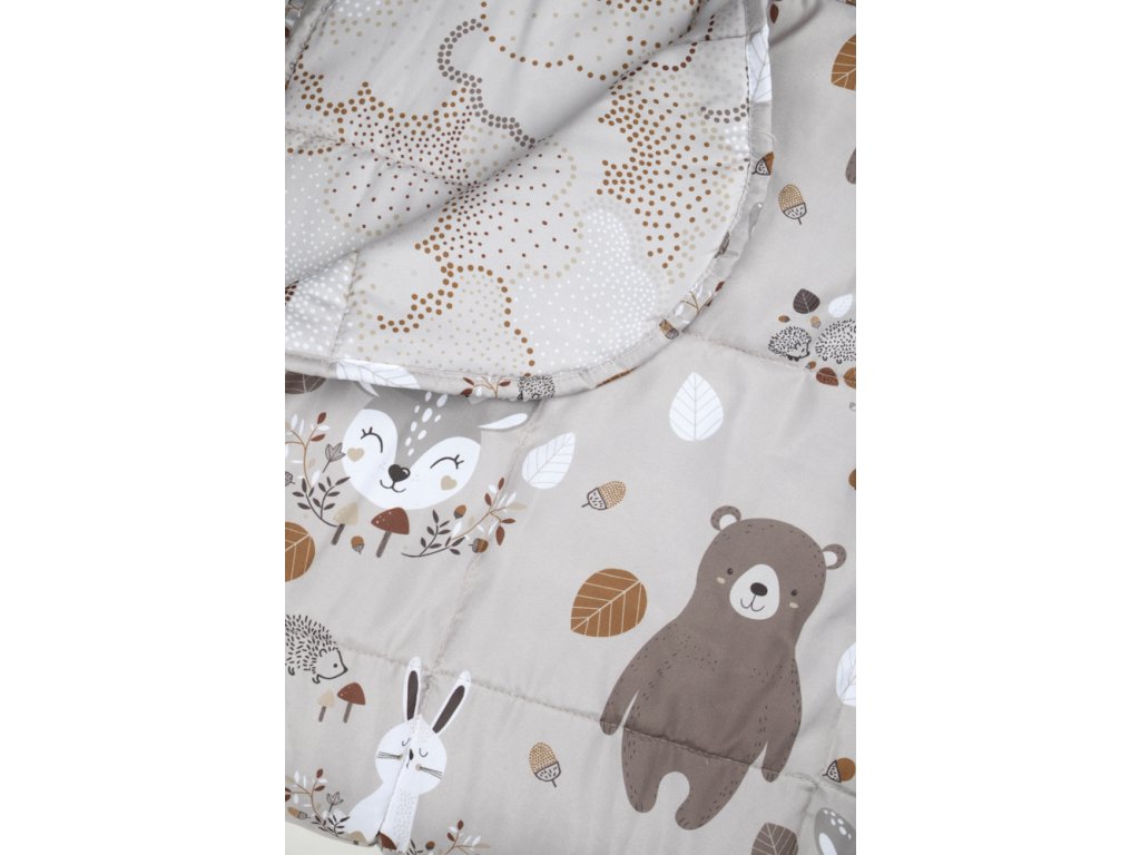 Táto roztomilá prešívaná prikrývka s obojstranným dizajnom je ideálna pre tých najmenších. Jedna strana je zdobená hravým motívom lesných zvieratiek, ako je srnka, medvedík a zajačik, čo dodáva prikrývke rozprávkový vzhľad. Druhá strana je v jemnejšom prevedení s bodkovaným vzorom, pripomínajúcim kvapky. Prikrývka je vyrobená z jemného materiálu, vďaka ktorému je mäkká a príjemná na dotyk, a poskytuje dieťaťu pocit pohodlia a bezpečia.