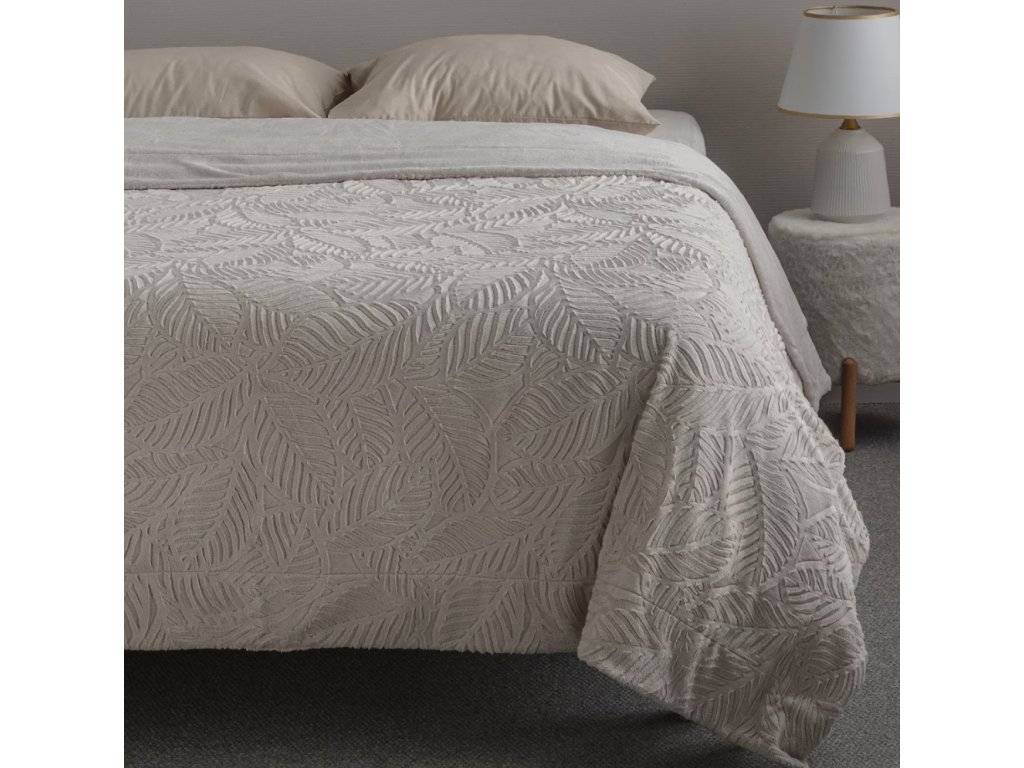 Béžová prikrývka na posteľ Riley je ponuka pre milovníkov kombinácie jemnosti a elegancie. Reliéfny vzor na prikrývke v tvare tesne usporiadaných listov jej dodáva textúru a romantickú atmosféru. Ide o doplnok do spálne, ktorý sa hodí ku každému zariadeniu a vyzerá dobre s akoukoľvek farbou. Zapáči sa ľuďom, ktorí v interiéri hľadajú neutrálne farby.