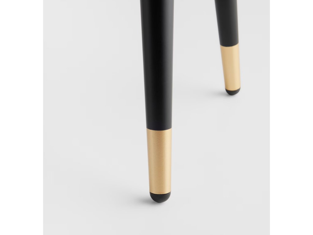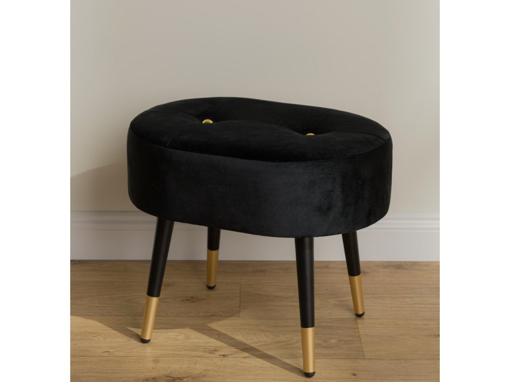 Čierne, zamatové telo so zlatými detailami – vrátane dekoratívnych gombíkov a zakončení nôh – dodáva nábytku vycibrený, moderný charakter. Oválny tvar, subtílny lesk velúru a geometrické prešívanie spôsobujú, že puf sa dokonale hodí do glamour, ako aj do moderných aranžmánov. Je štýlovým doplnkom do obývačky, spálne, šatníka alebo predsiene. Skvele poslúži aj ako originálny darček, ktorý podčiarkne individuálny vkus obdarovaného.