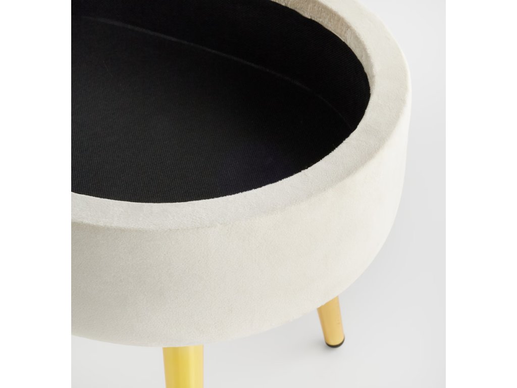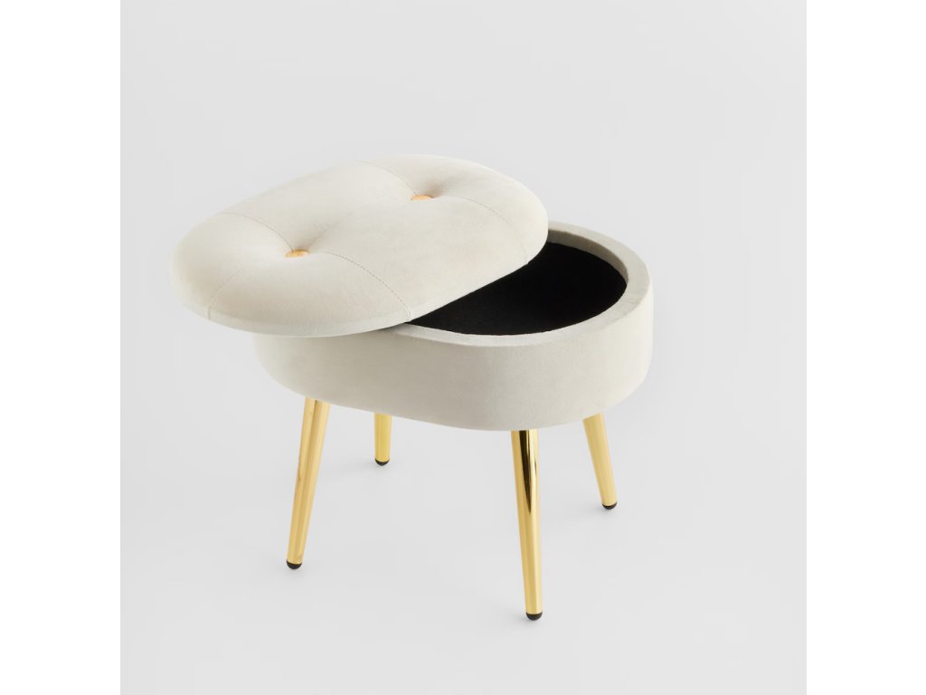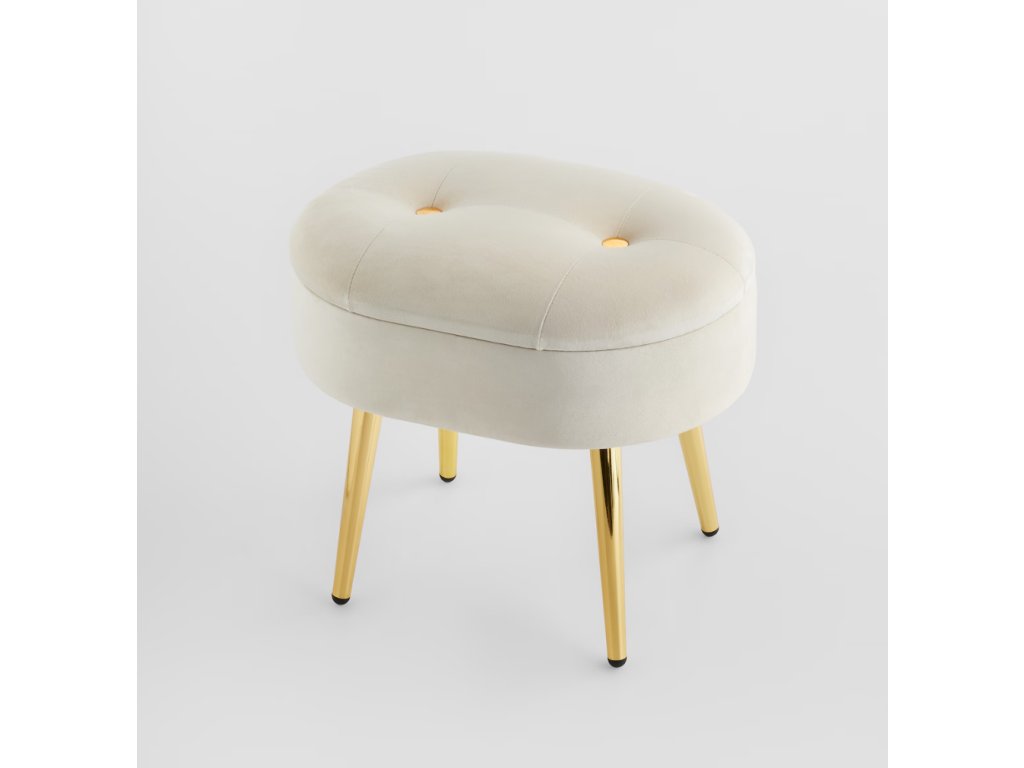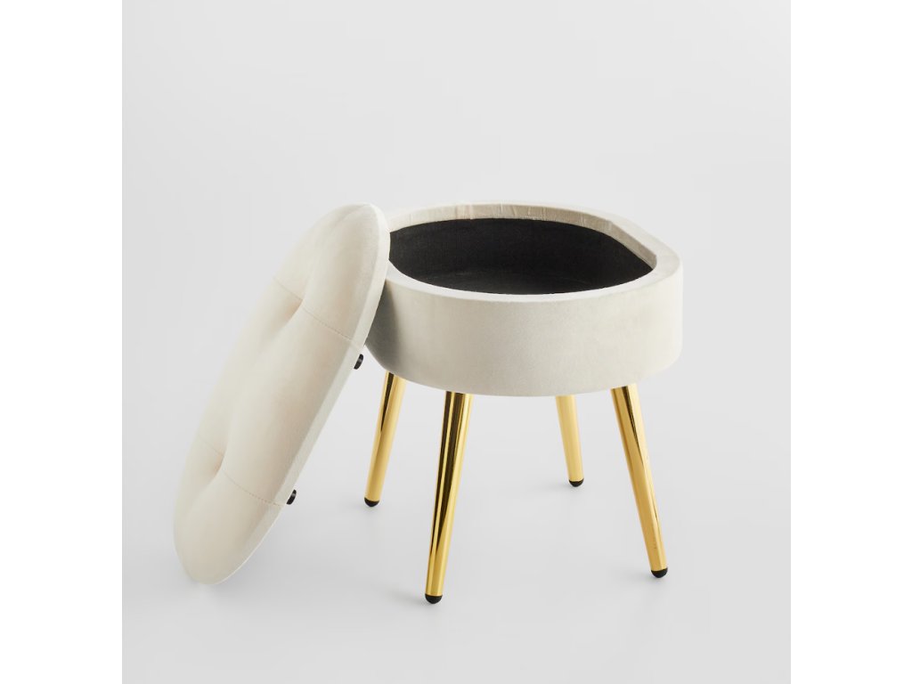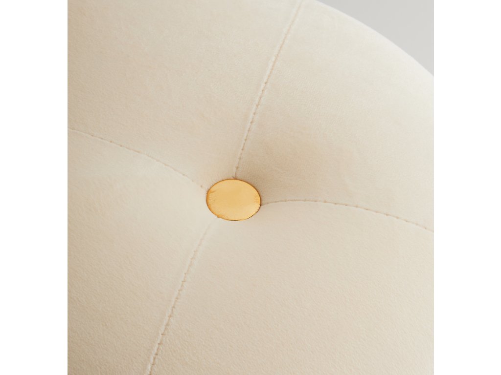 Luxusný béžový zamat (velúr) dodáva pufu jemnosť a nadčasovú eleganciu. Zlaté kovové nožičky a dekoratívne gombíky vytvárajú glamour štýl. Praktický úložný priestor vo vnútri (súprava obsahuje 2 prvky) pomôže udržať poriadok. Tento puf (výška 39 cm) sa skvele hodí ako štýlová podnožka, prídavné sedadlo alebo nočný stolík. Ideálny kúsok pre milovníkov sofistikovaného dizajnu.