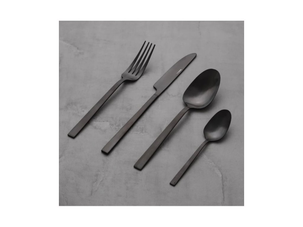 Čierna sada príborov s matným povrchom. Dokonale zapadá do modernej, elegantnej estetiky a je originálnym doplnkom stolovania. Nerezové príbory sú odolné voči chemickým a elektrochemickým reakciám a zostávajú v dobrom stave po dlhú dobu. Nemali by sa však umývať v umývačke riadu. Súprava príborov pozostáva z jednej čajovej lyžičky, lyžice, vidličky a noža.