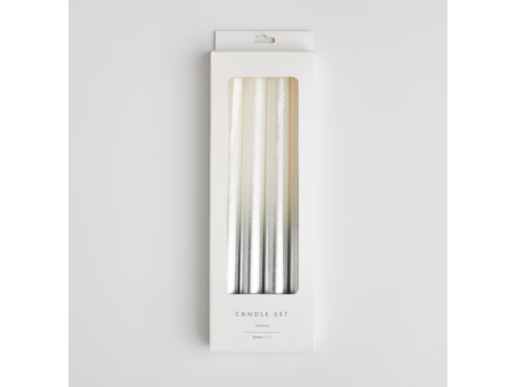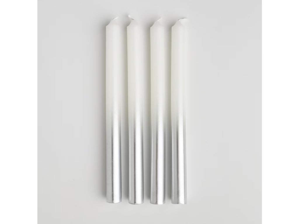 Súprava štyroch sviečok z vosku v elegantnej, svetlostriebornej farbe. Sviečky sa vyznačujú štíhlym, štýlovým vzhľadom, ideálnym na podčiarknutie elegantného charakteru interiéru. Skvele sa hodia ako dekorácia stola na špeciálne príležitosti alebo ako decentný prvok každodennej výzdoby.