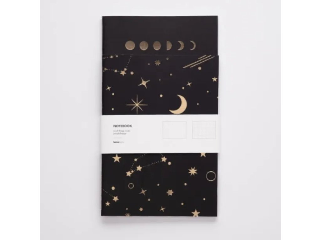 Elegantná a inšpiratívna súprava dvoch čiernych zápisníkov ozdobených jemnými zlatými prvkami, ktoré odkazujú na kozmickú tému.