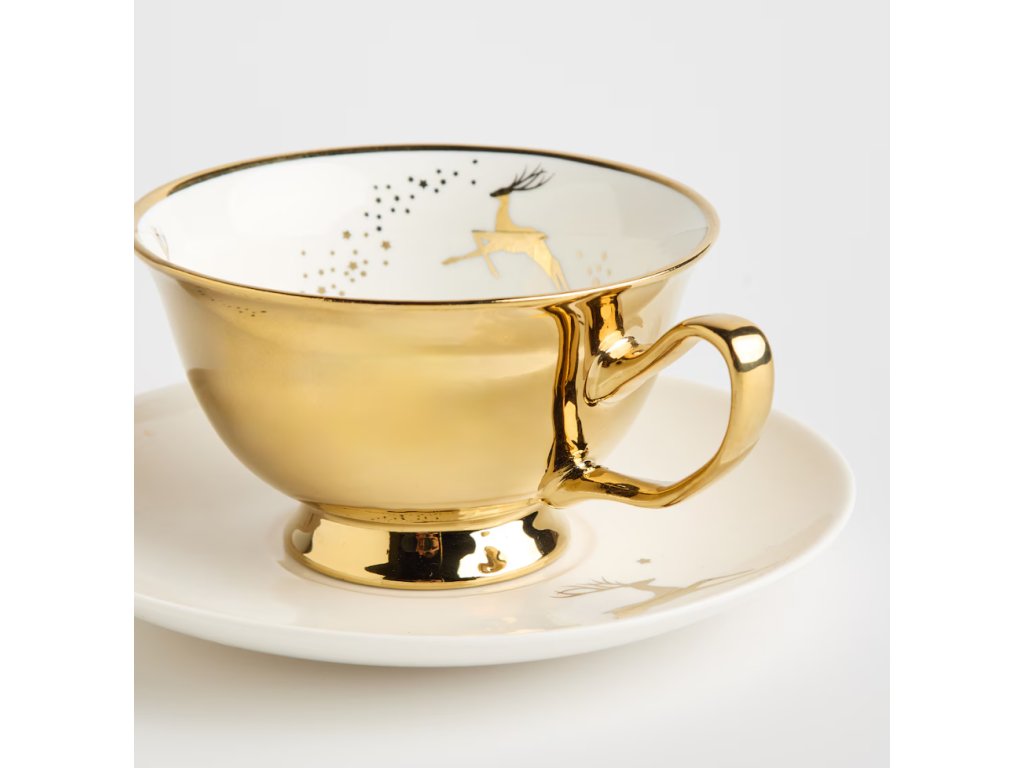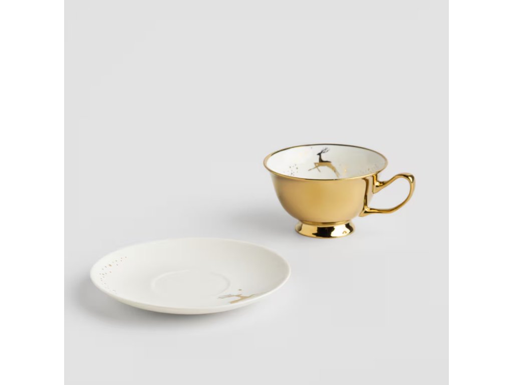 Zlatá šálka so snehobielou podšálkou tvorí elegantný a sviatočný duet. Jemný motív soba a zlatých hviezdičiek dodáva celku magickú príťažlivosť. Šálka s podšálkou Dirdis sa ideálne hodí do sviatočného interiéru a tiež bude skvelým nápadom na darček pre blízku osobu.