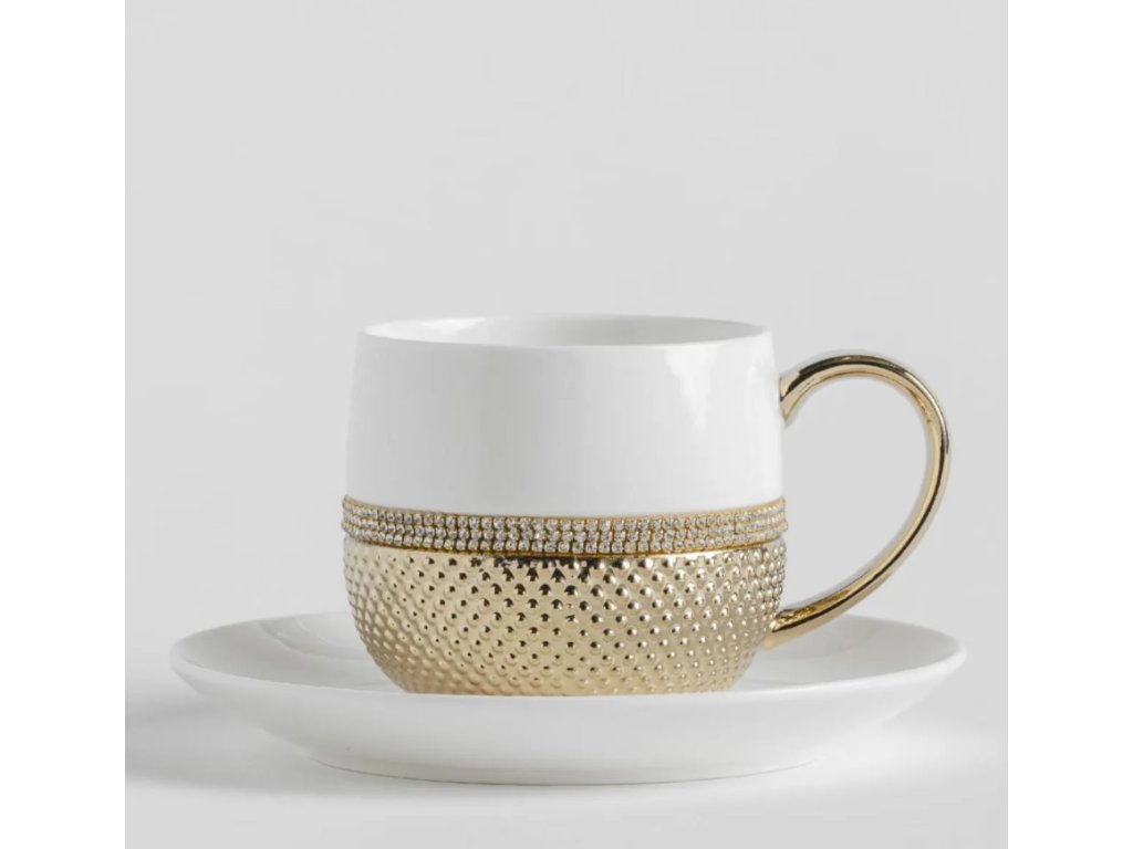 Mimoriadne elegantná šálka na kávu alebo čaj. Podšálku, ozdobenú zlatom, vypuklými bodkami a imitáciou malých diamantov, sprevádza biela podšálka.