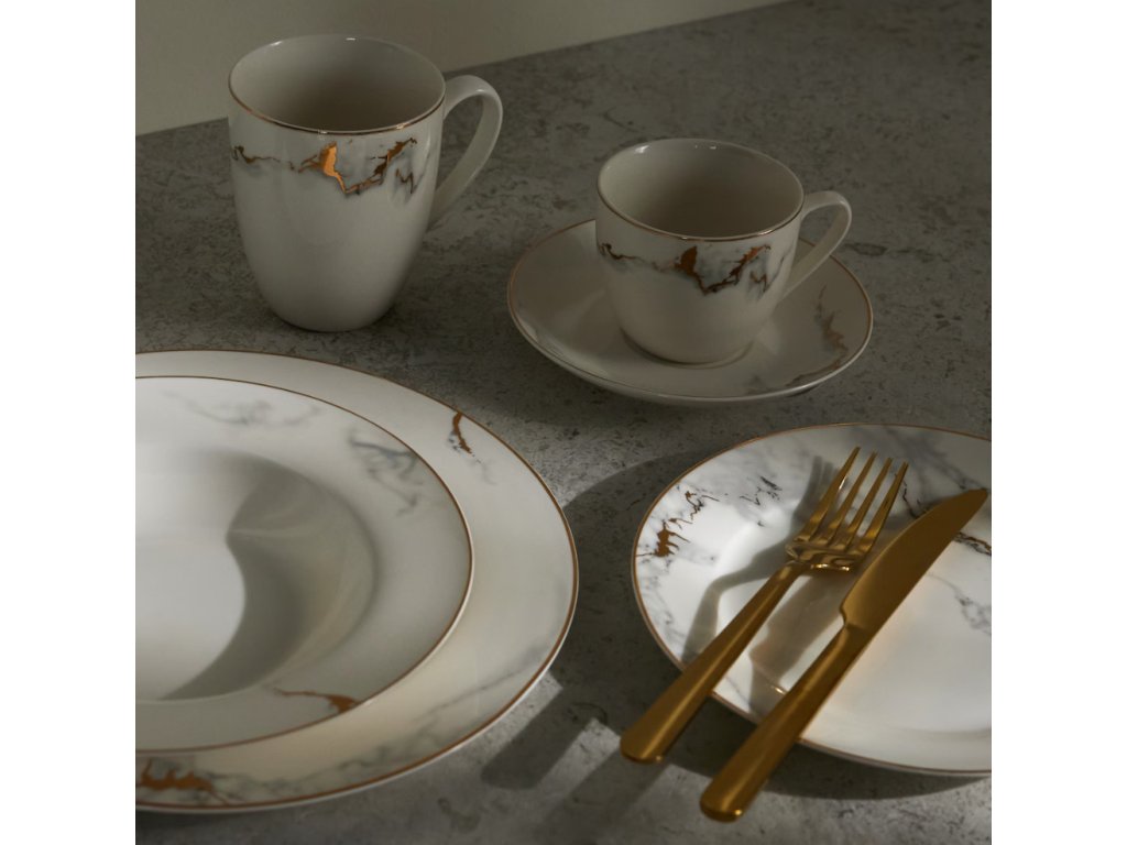 Biely, krémový odtieň s mramorovým vzorom v zlatej farbe dodáva šálke jemnosť a sofistikovanosť. Nepravidelné línie vzoru, umiestnené na šálke aj na podšálke, pripomínajú prirodzenú krásu mramoru a zapadajú do nadčasového dizajnu tejto súpravy. Jemný, tenký zlatý okraj lemuje hrany, kontrastuje s hladkým povrchom porcelánu. Súprava obsahuje šálku s objemom 190 ml a okrúhlu podšálku. Klasický tvar uška zaisťuje pohodlné uchopenie a celok vytvára harmonickú kompozíciu, ktorá zaujme precíznym spracovaním a zmyslom pre detail. Vynikajúca voľba nielen na každodenné chvíle, ale aj počas rodinných osláv alebo stretnutí pri stole.