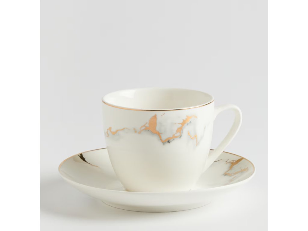 Prvé ranné lúče sa odrážajú od jemného porcelánu, keď siahnete po šálke s podšálkou marberis. Hladký, krémový povrch je rozžiarený jemným, nepravidelným mramorovým vzorom v odtieňoch zlata, ktorý pripomína stopy času zaznamenané na drahom kameni. Ozdobný tenký okraj na hrane šálky a podšálky priťahuje pohľad a robí z každého dúšku kávy každodenný rituál – chvíľu, ktorú chcete oslavovať. Klasický tvar nádoby a minimalistická forma zdôrazňujú univerzálny charakter súpravy, ktorá sa dokonale hodí k modernému aj tradičnému stolovaniu. Táto šálka nie je len sviatkom pre zmysly, ale aj symbolom zmyslu pre detail a pohodlia, ktoré vytvárajú výnimočnú atmosféru stretnutí.