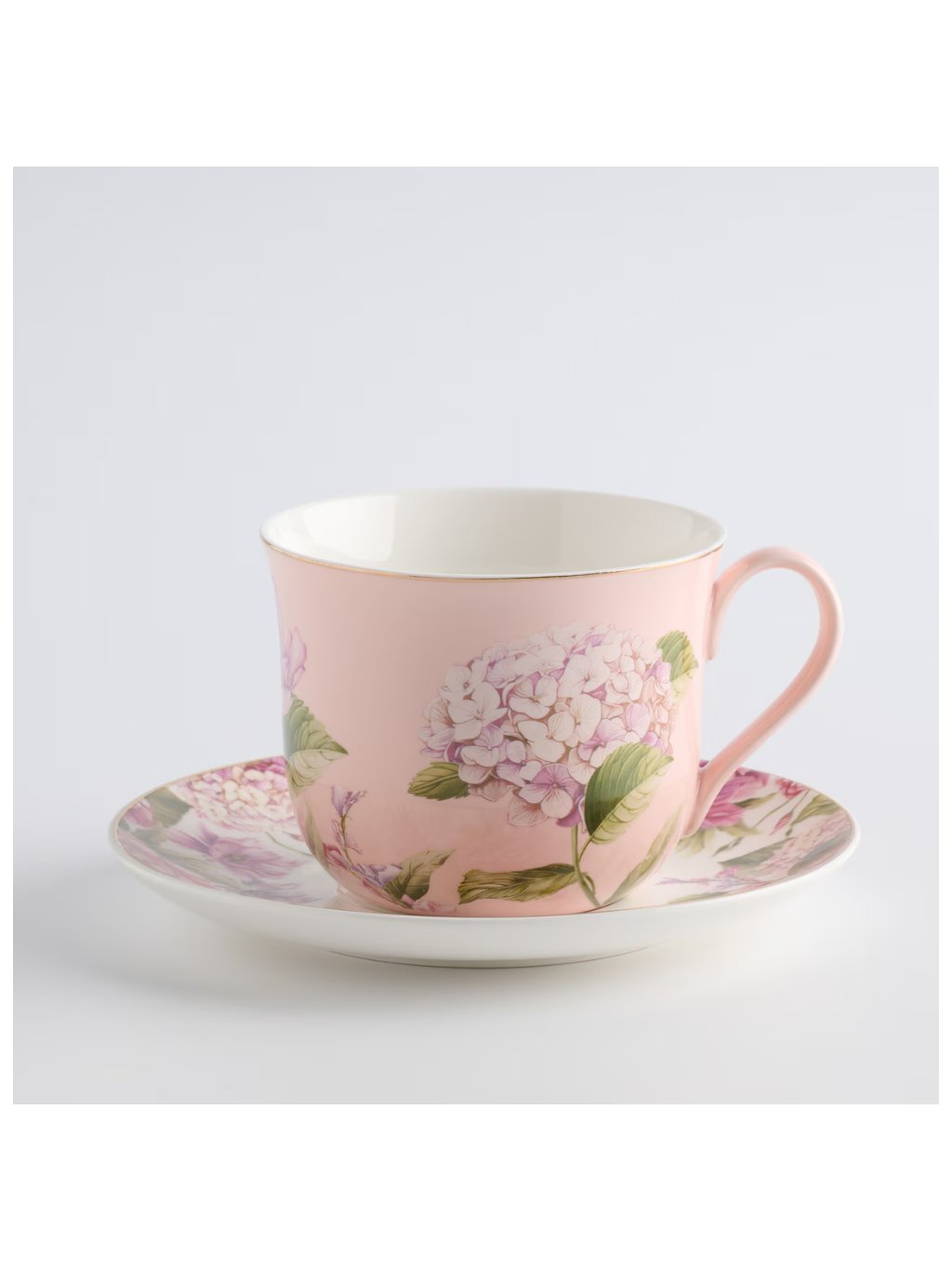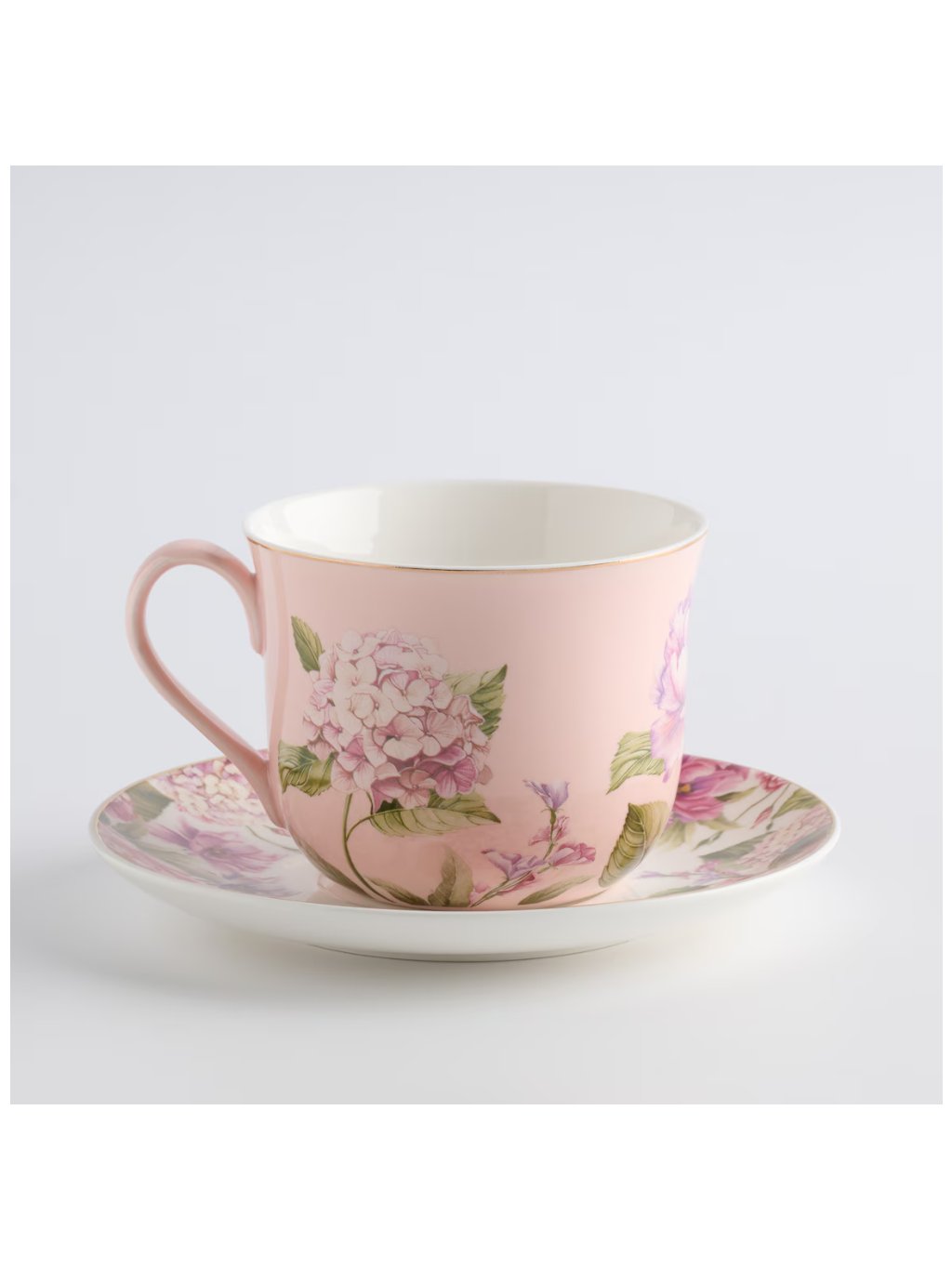 Romantický charakter: Svetloružová šálka s kvetinovým motívom a fajnovou zlatou potlačou prináša na stôl romantiku a nádych luxusu.