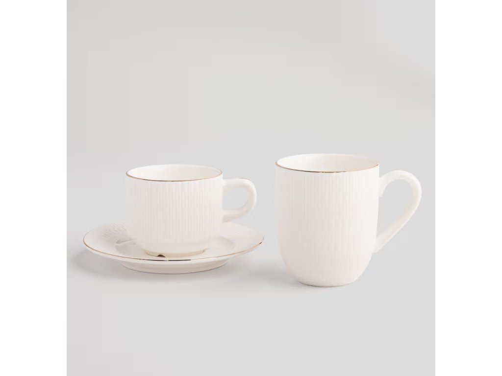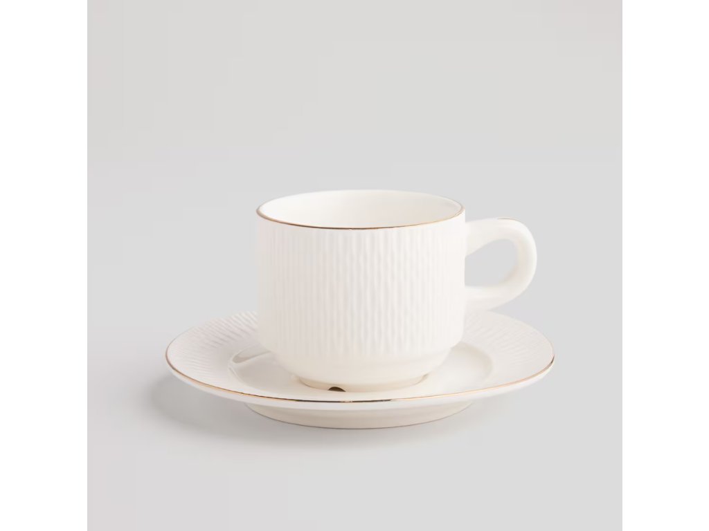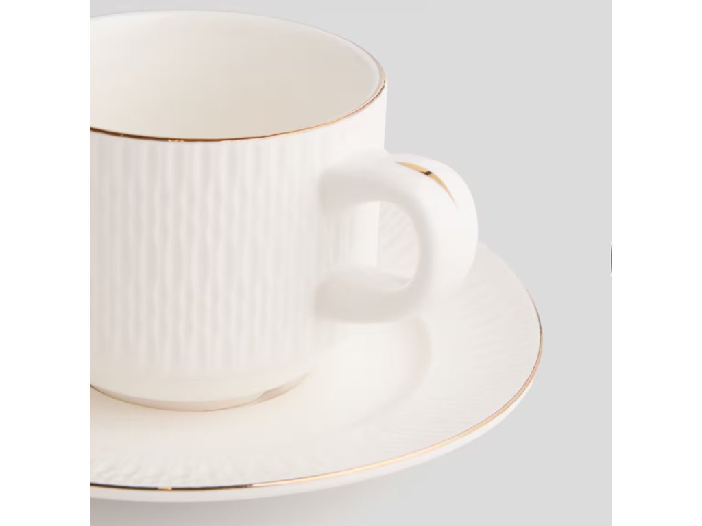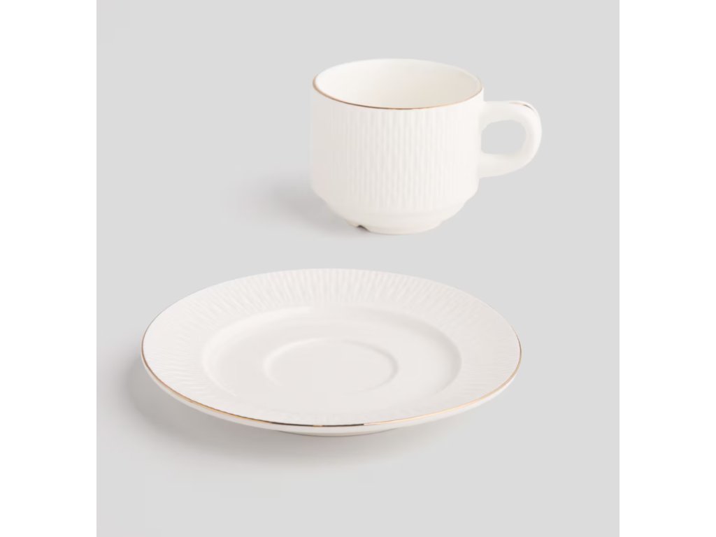 Elegantná šálka s podšálkou vyrobená z porcelánu v klasickej bielej farbe, ozdobená jemným zlatým okrajom. Je ideálna na štýlové servírovanie kávy alebo čaju, a to ako na každodenné použitie, tak aj na výnimočné príležitosti. Jemný, no zároveň odolný materiál dodáva celku ľahkosť a eleganciu, čím podčiarkne estetiku každého stolovania. Ide o ideálnu voľbu pre milovníkov klasického dizajnu s nádychom luxusu.