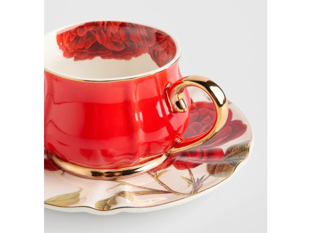 Súprava Rosellina očarí intenzívnou červenou farbou, ktorá dodáva energiu a oživuje interiér. Zlaté vyhotovenie a jemný, vlnitý okraj podšálky podčiarkujú jej elegantný charakter. Súprava sa ideálne hodí do klasických aj moderných aranžmánov, dodávajúc im nádych sofistikovanosti. Je to vynikajúci nápad na darček pre blízku osobu.